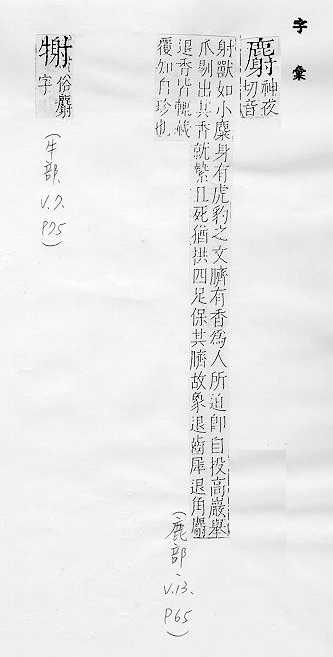 〔~鼠〕哺乳动物,毛棕黑色。生活在沼泽地带,毛皮可做衣服。 〔~牛〕哺乳动物,体形像牛而稍小,皮下有腺体,分泌物有特殊气味。生活在北美洲的极北地区。 哺乳动物,形状像鹿而小,无角。雄的脐部有香腺,能分泌麝香。通称“香獐子”。