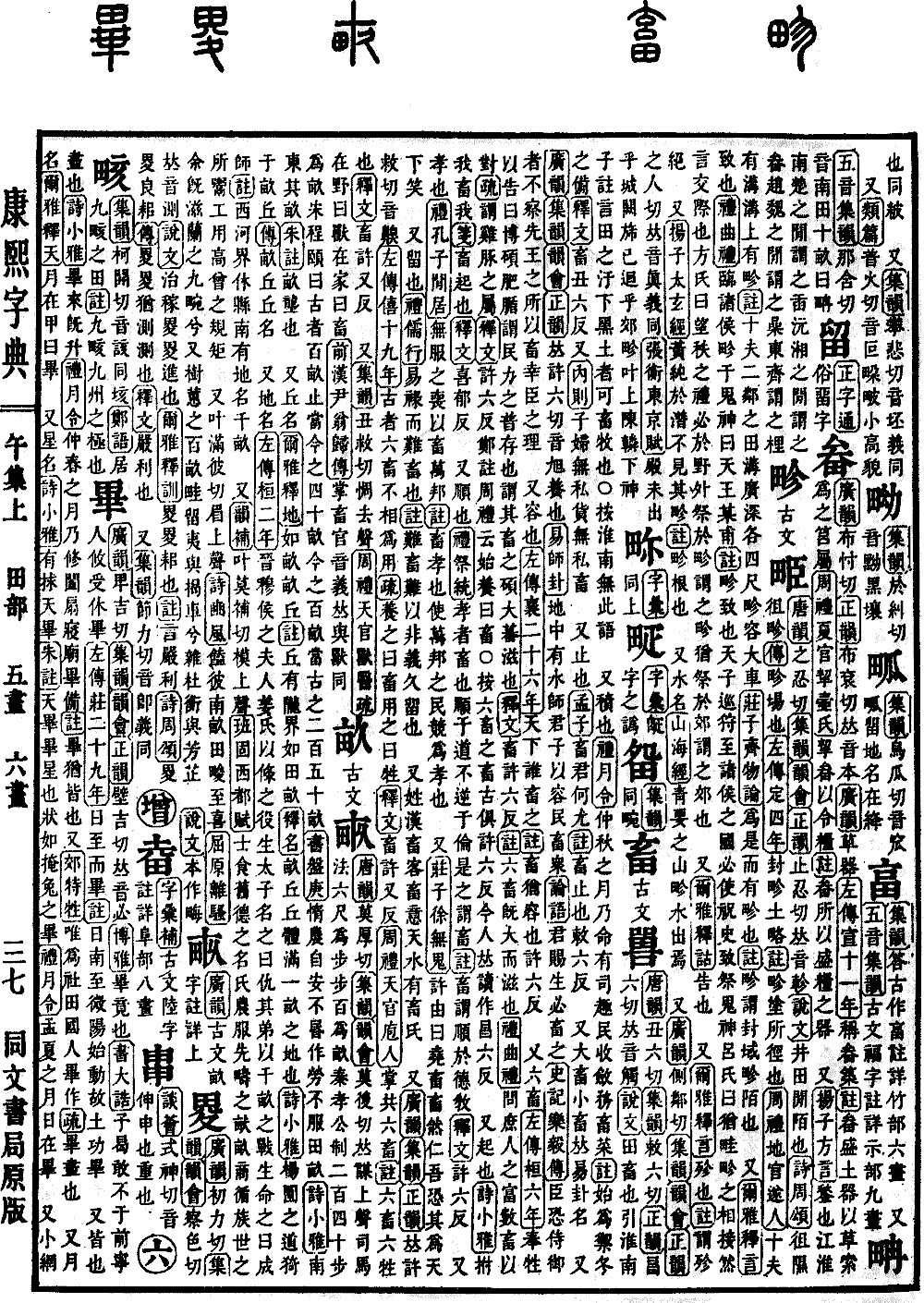 〔古文〕𤱑《唐韵》莫厚切《集韵》《韵会》莫后切,𠀤谋上声。司马法,六尺为步,步百为亩。泰孝公制,二百四十步为亩。宋程颐曰:古者百亩,止当今之四十亩。今之百亩,当古之二百五十亩。《书·盘庚》惰农自安,不昬作劳,不服田亩。《诗·小雅》南东其亩。《朱注》亩,垄也。 又丘名。《尔雅·释地》如亩亩丘。《注》丘有陇界,如田亩。《释名》亩丘,丘体满一亩之地也。《诗·小雅》杨园之道,猗于亩丘。《传》亩丘,丘名。 又地名。《左传·桓二年》晋𥠇侯之夫人姜氏,以条之役生太子,命之曰仇。其弟以千亩之战生,命之曰成师。《注》西河界休县南有地,名千亩。 又《韵补》叶莫补切,模上声。《班固·西都赋》士食旧德之名氏,农服先畴之畎亩。商循族世之所鬻,工用高曾之规矩。 又叶满彼切,眉上声。《诗·豳风》馌彼南亩,田畯至喜。《屈原·离骚》余既滋兰之九畹兮,又树蕙之百亩。畦留夷与揭车兮,杂杜衡与芳芷。 《说文》本作畮。*考证:〔《左传·桓二年》晋𥠇侯之夫人姜氏,以条之役生太子,名之曰仇。〕 谨照原文名之改为命之。〔《班固·西都赋》农服先畴之𤱶亩。〕 谨照原文𤱶改畎。