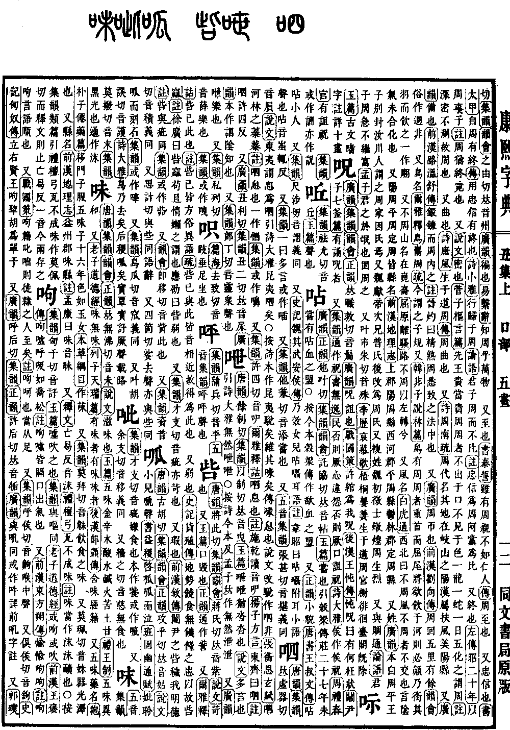 《广韵》《集韵》《韵会》《正韵》𠀤职救切,音䯾。《广韵》呪诅也。《战国策》许绾为我呪。《后汉·王忳传》忳呪曰:有何枉状。《关尹子·七釜篇》有诵呪者。 又《集韵》通作祝。《书·无逸》民否,则厥心违怨否,则厥口诅祝。《诗·大雅》侯作侯祝。《周礼·春官》有诅祝。 《集韵》或作詶,亦作詋。