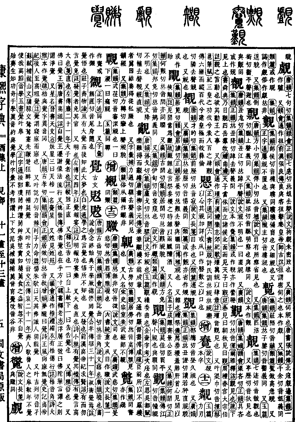 〔古文〕覐𧠭《唐韵》古岳切《集韵》《韵会》《正韵》讫岳切,𠀤音角。《说文》寤也。《广韵》晓也。《书·说命》念终始典于学,厥德修罔觉。《公羊传·昭三十一年》叔术觉焉。《注》觉,悟也。《庄子·齐物论》且有大觉,而后知此大梦也。《白虎通》学之为言觉也,悟所不知也。 又发也。《前汉·高帝纪求贤诏》有而勿言觉免。《注》发觉者,免其官。 又明也。《左传·文四年》以觉报宴。《注》以明报功宴乐。 又大也,直也。《诗·小雅》有觉其楹。《传》有觉,言高大也。《笺》直也。《左传·襄二十一年》夫子觉者也。《注》较然正直。 又《释名》告也。一曰自上敕下。一曰告,告觉也。 又《博雅》哲也。 又佛曰觉王。《旧唐书·高祖诏》自觉王迁谢,像法流行。又《姚崇传》佛者,觉也,在乎方寸。《魏书·释老志》浮屠正号曰佛陀,华言译之则谓净觉。 又星名。《晋书·天文志》妖星三曰天棓。一名觉星。 又姓,见《姓苑》。 又《韵会》通作梏。《礼·缁衣》有梏德行。《注》梏,音角。《诗·大雅》本作觉。《疏》梏与觉字异音同。 又《唐韵》古孝切《集韵》《韵会》《正韵》居效切,𠀤音敎。《增韵》梦醒曰觉。《诗·王风》尚寐无觉。《史记·高帝纪》后人至高祖觉。《注》觉谓寝寐而寤也。 又叶讫力切,音棘。《列子·力命篇》杨朱歌曰:天其弗识,人胡能觉。 又叶吉列切,音孑。《苏轼·补龙山文》骥騄交骛,驽蹇先蹶,楚狂醉乱,陨帽莫觉。 又叶古爻切,音交。《左传·哀二十一年》齐人歌:鲁人之皋,数年不觉,使我高蹈。《音学五书》觉叶㡍。 又《正字通》按郭璞菵草赞:菵草赤茎,实如蘡薁。食之益智,忽不自觉,殆齐生知,功奇于学。薁音约,与觉、学叶。字汇不考郭赞上下文,泥。吴棫《韵补》薁音育,觉攺音谷,非。*考证:〔《苏轼·补龙山文》骥騄交鹜,鴑蹇先蹶,楚狂醉乱,䧎帽莫觉。〕 谨照原文鹜改骛。鴑改驽。䧎改陨。