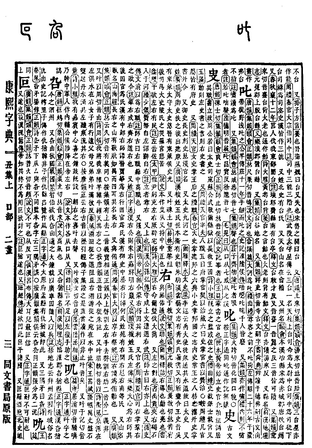 《唐韵》于救切《集韵》《韵会》尤救切《正韵》爰救切,𠀤音峟。与祐佑通。《说文》助也。《尔雅·释诂》右,导也,勴也,亮也。《书·益稷》予欲左右有民。《注》左音佐。《太甲》惟尹躬,克左右,厥辟宅师。《诗·大雅》保右命尔,燮伐大商。 又左之对也。《书·禹贡》夹右碣石入于河。《礼·少仪》赞币自左,诏辞自右。《注》立者尊右。 又上也。《前汉·公孙弘传》守成上文,遭遇右武。《注》师古曰:右亦上也。又《循吏传》文翁以为右职。《注》师古曰:右职,县中高职也。 又强也。《后汉·明帝纪》无令豪右,得固其利。 又官名。《周礼·夏官》司右,掌羣右之政令。《注》羣右,戎右,齐右,道右也。 又姓。《正字通》汉右公弼,宋右嘉祥,明右岩。又《广韵》汉复姓,五氏。左传𡭢乐大心为右师,其后因官为氏,汉有中郞右师谭。晋贾华为右行,因官为氏,汉有御史中丞右行绰。何氏姓苑有右闾、右扈、右南等氏。 又山名,兽名。《山海经》长右之山有兽,状如禺而四耳,其名长右。 又与侑通。《周礼·春官·大祝》以享右祭祀。《注》右读为侑。劝也。 又《广韵》《集韵》《韵会》《正韵》𠀤云久切,音有。义同。○按《集韵》有上去二音,义实相通。《正韵》于上声训左右手,去声训右助,二音分二义,非。 又叶以周切,音由。《诗·周颂》我将我享,维羊维牛,维天其右之。○按《唐韵》正音以。今从朱注。 又叶羽轨切,音以。《诗·衞风》泉源在左,淇水在右。女子有行,远父母兄弟。弟叶满彼反。《秦风》溯徊从之,道阻且右。溯游从之,宛在水中沚。《宋玉·笛赋》隆崛万丈,盘石双起。丹水涌其左,醴泉流其右。○按《唐韵》正云:右古音以历引经传子集证之,是直当读作以,非止叶音矣。 又叶于记切,音异。《诗·小雅》我有嘉賔,中心喜之。钟鼓既设,一朝右之。喜叶去声。 又叶演女切,音与。《陆云·陆丞相诔》乃干中军,入作内辅。公侯陟降,在帝左右。 《说文》本作𠮢,从口从又。《徐锴曰》言不足以左复手助之。*考证:〔又叶于记切,音意。〕 谨按于属喻母,意属影母,于记切非意字之音,谨照字母音意改音异。