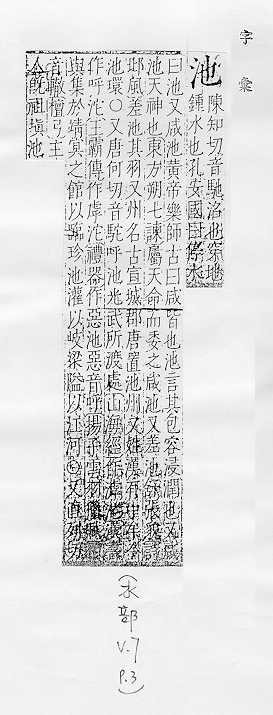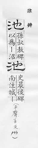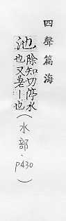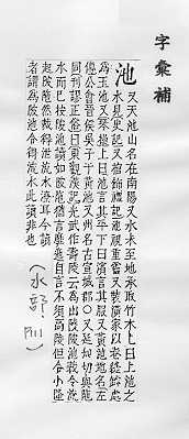水塘,多指人工挖的:~子。水~。~鱼之殃(喻因牵连而受到的灾祸。亦称“池鱼之祸”)。 湖:~盐(从咸水湖采取的盐,成分和海盐相同)。 像水池的:浴~。花~。乐(yuè)~。舞~。 护城河:城~。金城汤~。 旧时指剧场中正厅前部:~座。 姓。