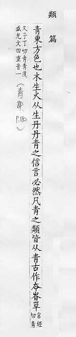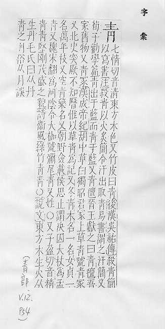 深绿色或浅蓝色:~绿。~碧。~草。~苔。~苗。~菜。~葱。~山绿水。~云直上。万古长~(喻高尚的精神或深厚的友情永远不衰)。 绿色的东西:踏~。~黄不接。 靛蓝色:靛~。~紫。~出于蓝,胜于蓝。 黑色:~布。~线。~衫。~衣。 喻年轻:~年。~春。~工。 竹简:~简。~史(原指写在竹简上的记事,后指史书,如“永垂~~”)。