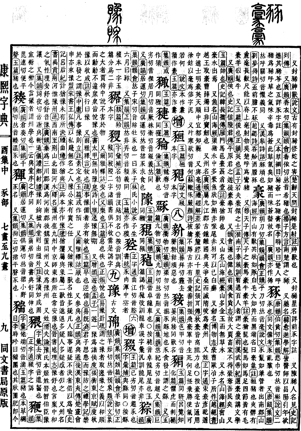 《广韵》胡刀切《集韵》《韵会》《正韵》乎刀切,𠀤音毫。《说文》豕鬣如笔管者,出南郡。《山海经》竹山有兽,其状如豚,白毛,大如筓而黑端,名曰豪彘。《注》𧱂猪也。夹髀有麄毫,长数尺,能以脊上毫射物,吴越呼为鸾猪。 又《穆天子传》天子之豪马、豪牛、豪羊。《注》豪,犹髭也。髭马如马,足四节皆有毛。豪羊似髦牛。 又《玉篇》俊也。《正韵》英也。《孟子》若夫豪杰之士。《淮南子·泰族训》智过百人者,谓之豪。《前汉·武帝纪》选豪俊,讲文学。 又《广韵》侠也。《史记·信陵君传》平原君之游徒豪举耳。 又《韵会》彊也,健也。《前汉·食货志》故大贾畜家不得豪夺吾民矣。 又《玉篇》帅也。《史记·韩长孺传》雁门马邑豪聂翁壹。《注》豪,犹帅也。 又山名。《山海经》豪山多金玉而无草木。 又水名。《山海经》密山,豪水出焉。 又鱼名。《山海经》渠猪水中多豪鱼,状如鲔,赤喙,尾赤羽,可以已白癣。 又劒名。《博物志》豪曹,欧冶子所作。《越绝书》越王取豪曹,薛烛曰:非宝劒也。 又州名。《广韵》属九江郡,古钟离国,与吴争桑而灭,隋攺为豪州。 又姓。《正字通》宋豪彦,乾道中进士。明豪英,天顺中宜都知县。 又与毫通。《礼·经解》差若豪厘,缪以千里。《史记·张耳传》秋豪皆高祖力也。○按豪、毫古通用。徐铉以毫为俗字,泥。 又叶寒歌切,音何。《苏辙·咏严颜诗》被擒不辱古亦有,吾爱善折张飞豪。军中生死何足怪,乗胜使气可若何。 《说文》本作𩫞。籀作𩫕。《玉篇》亦作𩫚。