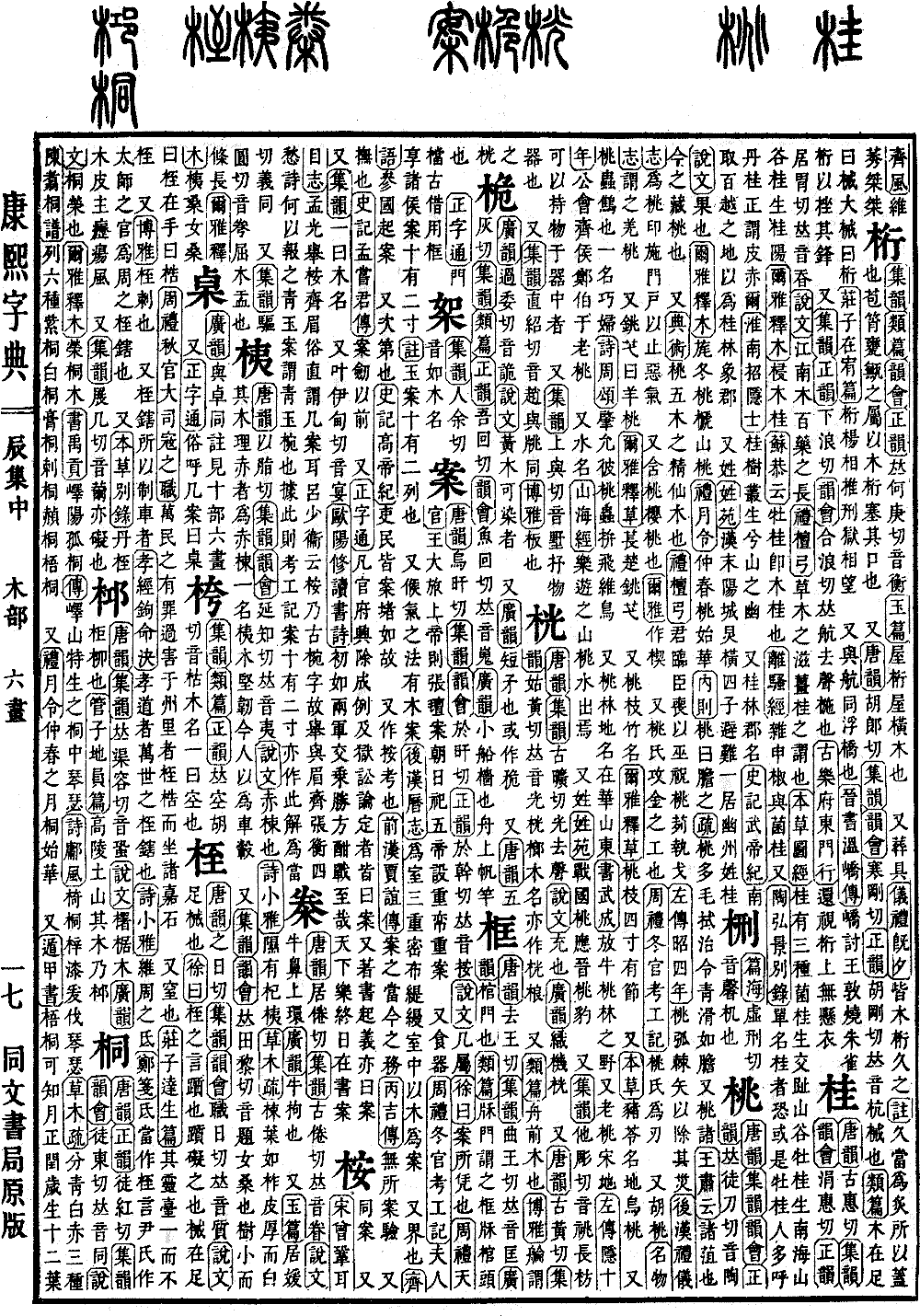 《唐韵》古惠切《集韵》《韵会》涓惠切《正韵》居胃切,𠀤音昋。《说文》江南木,百药之长。《礼·檀弓》草木之滋,姜桂之谓也。《本草图经》桂有三种:菌桂生交趾山谷,牡桂生南海山谷,桂生桂阳。《尔雅·释木》梫,木桂。《苏恭云》牡桂即木桂也。《离骚经》杂申椒与菌桂。又《陶弘景·别录》单名桂者,恐或是牡桂,人多呼丹桂,正谓皮赤尔。《淮南·招隐士》桂树丛生兮山之幽。 又桂林,郡名。《史记·武帝纪》南取百越之地,以为桂林、象郡。 又姓。《姓苑》汉末,阳城炅横四子避难,一居幽州,姓桂。