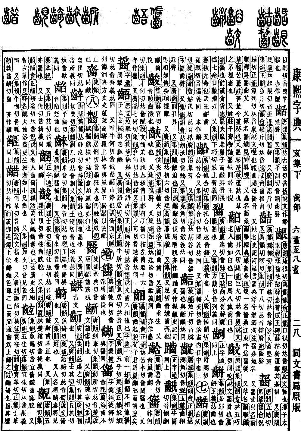 《广韵》《集韵》《韵会》《正韵》𠀤测角切,音娖。《玉篇》齿相近声。 又《广韵》开孔具。 又《集韵》龌龊,迫也。《正韵》龌龊,急促局陿貌。亦作齱𪘏。又作握龊。《史记·司马相如传》委琐握龊。 又《广韵》《集韵》𠀤初六切,音珿。《广韵》廉谨貌。 又《集韵》叉足切,音娕。齿齐也。