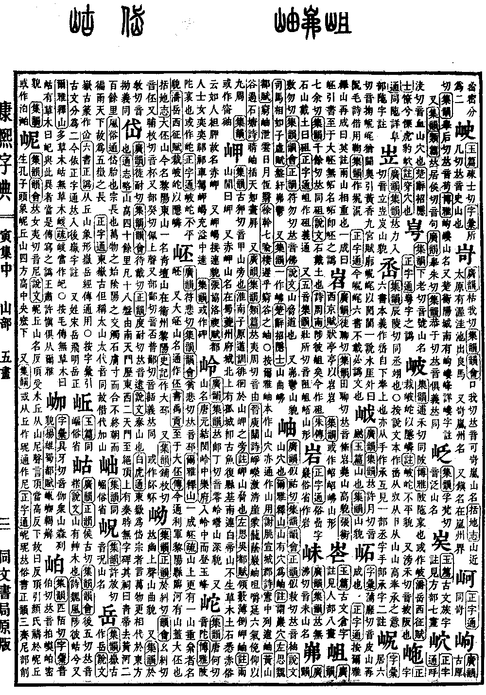 《正字通》俗嵒字。岩俗省作岩。*(岩)《唐韵》五衔切《集韵》鱼衔切《韵会》疑衔切《正韵》鱼咸切,𠀤音嵒。《说文》岸也。从山严声。《增韵》石窟曰岩,深通曰洞。 一曰险也。《左传·隐元年》制岩邑也。《公羊传·僖三十三年》殽之嵚岩,文王所避风雨也。 又嶃岩,高峻貌。《司马相如·上林赋》崭岩嵾嵳。 又岩廊,殿庑也。《汉武帝·策贤良制》虞舜之时,游于岩廊之上。 又地名。《书·说命》说筑傅岩之野。《传》傅岩,在虞虢之闲。 又《集韵》鱼锨切《韵会》疑锨切,𠀤音严。岩岩,高貌。《诗·鲁颂》泰山岩岩,鲁邦所詹。 又《正字通》本作严。亦作岩。通作礹嵒碞。○按岩与嵒同。《说文》嵒,五咸切,山岩也。岩,五缄切,岸也。同字分训岩,专训岸,𠀤非。严岩礹𠀤从𠭖作。*(岩)考证:〔《公羊传·僖三十二年》殽之嵚岩,文王所避风雨处。〕 谨照原文三十二年改三十三年。处改也。