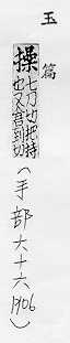 拿,抓在手里:~刀。~觚(手持木简,指写诗作文)。~管(执笔,指写作)。~刀必割(喻不失时机,要当机立断)。 控制、掌握:~舟。~纵。 从事:~心。~办。~作。~持。~劳。~之过急。 体力的锻炼,军事的训练:~练。~场。~演。上~。 用某种语言或方言讲话:他~一口闽南音。 行为,品行:~行。~守。 姓。