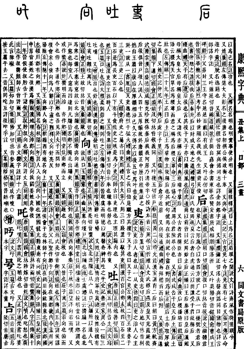 《唐韵》《集韵》《韵会》《正韵》𠀤许亮切,音蠁。《说文》北出牖也。从宀从口。《注》牖所以通人气,故从口。《玉篇》窻也。《诗·豳风》塞向墐戸。《传》北出牖也。《疏》士虞礼注云:向、牖一名也。北为寒之备,不塞南窻,故云北出牖也。《广韵》向与向通用。《集韵》亦作𤖽。《正韵》亦作鄕。《礼·明堂位》刮楹达鄕。◎按明堂位注,鄕谓夹戸窻也。每室八窻,为四达,则凡牖皆名鄕,不独北出牖矣。 又《广韵》对也。《战国策》西向事秦。《庄子·秋水篇》望洋向若而叹。 又或作向。《易·说卦》向明而治。 亦作鄕。《礼·明堂位》南鄕而立。 又《集韵》趣也。 又《韵会》救也。 又昔也。《庄子·寓言篇》若向也俯,而今也仰。 亦通作鄕。《论语》鄕也,吾见于夫子而问知。 又《广韵》《集韵》《韵会》《正韵》𠀤式亮切,音饷。《广韵》姓也。《左传·成五年》诸侯谋复会宋公,使向为人辞以子灵之难。《释文》向,舒亮反。 又《玉篇》地名。《诗·小雅》皇父孔圣,作都于向。《注》向在东都畿内,今孟州河阳县。《左传·隐十一年》王与郑人向。《注》轵县西有地,名向上。《襄十一年》诸侯会于北林师于向。《注》在𩒛川长社县东北。《后汉·郡国志》𩒛川郡有向鄕。 又《集韵》国名。《春秋·隐二年》莒人入向。《注》向,小国也,谯国龙亢县东南有向城。《史记·褚少孙补三皇纪》怡向申莒,皆姜姓之后,汉为县。《前汉·地理志》沛郡向县。《注》向,故国,姜姓,炎帝后。 又《集韵》《正韵》𠀤许两切,音向。《集韵》人字。《左传·襄十一年》晋侯使叔肸告于诸侯。《注》叔肸,叔向也。《释文》向,许文反。《前汉·𠛬法志》作叔向,颜师古:音许两反。 又《正韵》古文向字。注详十六画。*考证:〔《左传·襄十一年》晋侯使叔肹告于诸侯。《注》叔肹,叔向也。〕 谨照原文两肹字𠀤改肸。