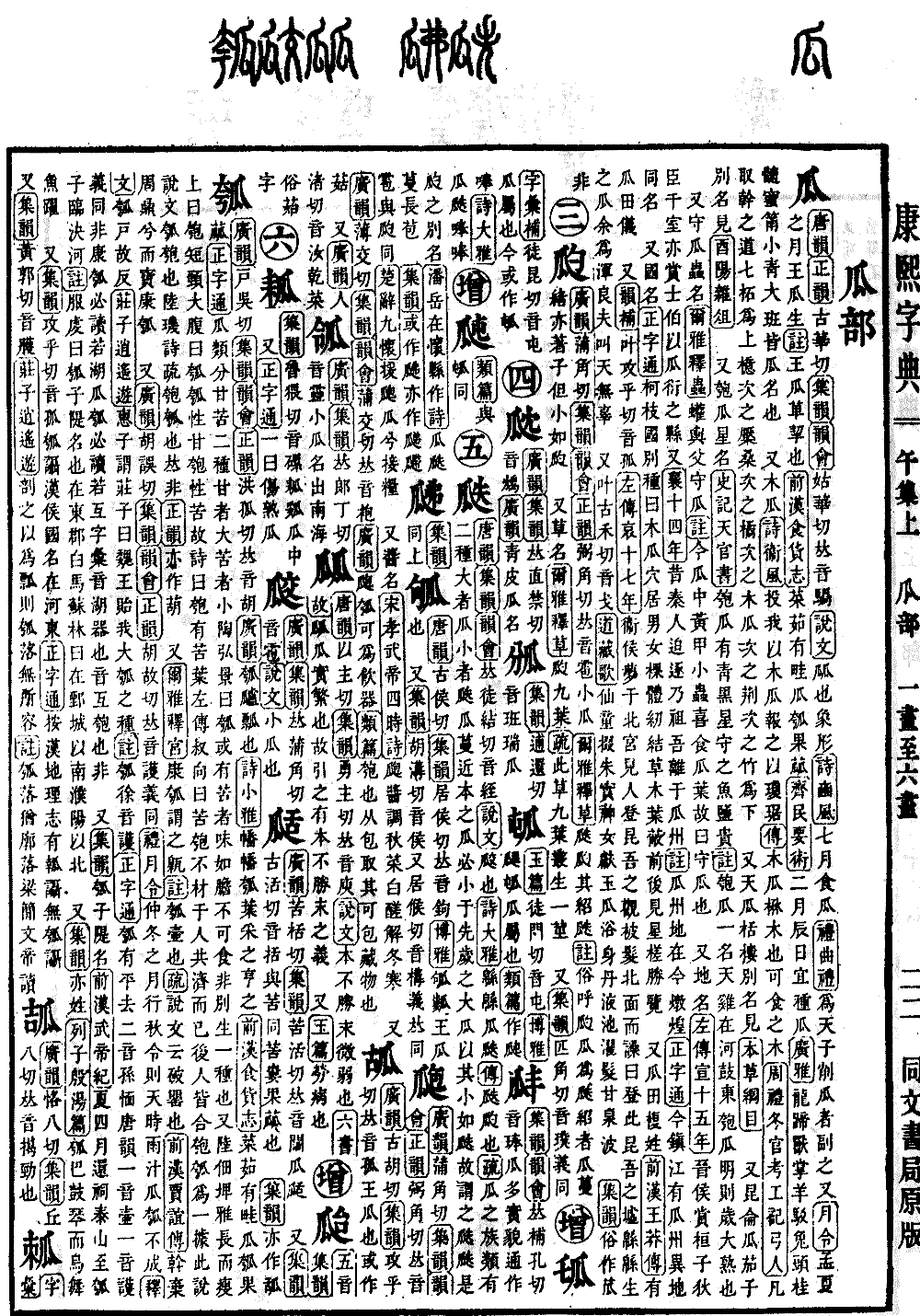 《唐韵》《正韵》古华切《集韵》《韵会》姑华切,𠀤音䯄。《说文》㼌也。象形。《诗·豳风》七月食瓜。《礼·曲礼》为天子削瓜者副之。又《月令》孟夏之月,王瓜生。《注》王瓜,萆挈也。《前汉·食货志》菜茹有畦瓜瓠果蓏。《齐民要术》二月辰日宜种瓜。《广雅》龙蹄兽掌,羊骹兔头,桂支蜜筩,𤬒蛌貍头,皆瓜属也。 又木瓜。《诗·衞风》投我以木瓜,报之以琼琚。《传》木瓜。楙木也。可食之木。《周礼·冬官考工记·弓人》凡取干之道七,柘为上,檍次之,檿桑次之,橘次之,木瓜次之,荆次之,竹为下。 又天瓜,栝楼别名。见《本草纲目》。 又昆仑瓜,茄子别名。见《酉阳杂俎》。 又匏瓜,星名。《史记·天官书》匏瓜有靑黑星守之,鱼盐贵。《注》匏瓜,一名天鸡。在河鼓东。匏瓜明,则岁大熟也。 又守瓜,虫名。《尔雅·释虫》蠸舆父,守瓜。《注》今瓜中黄甲小虫,喜食瓜叶。故曰守瓜也。 又地名。《左传·宣十五年》晋侯赏桓子狄臣千室,亦赏士伯以瓜衍之县。又《襄十四年》昔秦人迫逐,乃祖吾离于瓜州。《注》瓜州,地在今炖煌。《正字通》今鎮江有瓜州,异地同名。 又国名。《正字通》柯枝国别种曰木瓜。穴居,男女裸体,纫结草木叶蔽前后。见星槎胜览。 又瓜田,复姓。《前汉·王莽传》有瓜田仪。 又《韵补》叶攻乎切,音孤。《左传·哀十七年》衞侯梦于北宫,见人登昆吾之观,被发北面而譟,曰:登此昆吾之墟,緜緜生之瓜。余为浑良夫,叫天无辜。 又叶古禾切,音戈。《道藏歌》仙童掇朱实,神女献玉瓜。浴身丹液池,濯发甘泉波。 《集韵》俗作苽,非。*考证:〔《广雅》龙蹄兽掌,羊驳兔头,桂髓蜜筩,小靑大班,皆瓜名也。〕 谨照原文驳改骹。髓改支。小靑大班改𤬒蛌貍头。瓜名改瓜属。