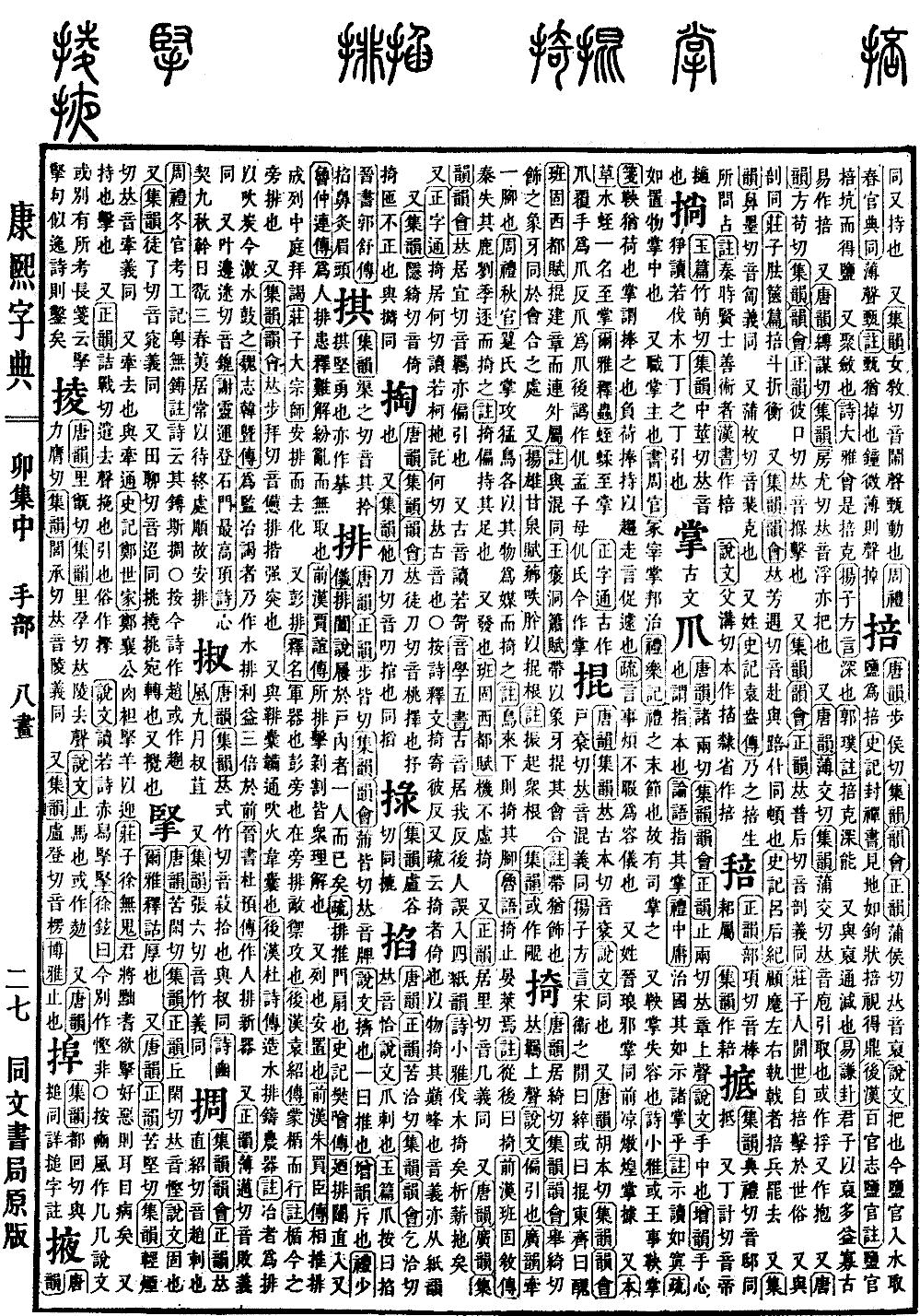 《唐韵》《正韵》步皆切《集韵》《韵会》蒲皆切,𠀤音牌。《说文》挤也。一曰推也。《增韵》斥也。《礼·少仪》排阖说屦于戸内者,一人而已矣。《疏》排推门扇也。《史记·樊哙传》廼排闼直入。又《鲁仲连传》为人排患释难,解纷乱而无取也。《前汉·贾谊传》所排击剥割,皆众理解也。 又列也,安置也。《前汉·朱买臣传》相推排成列中庭拜谒。《庄子·大宗师》安排而去化。 又彭排。军器也。《释名》彭旁也。在旁排敌御攻也。《后汉·袁绍传》蒙楯而行。《注》楯今之旁排也。 又《集韵》《韵会》𠀤步拜切,音惫。排揩,强突也。 又与𩋂囊韛通。吹火韦囊也。《后汉·杜诗传》造水排铸农器。《注》冶者为排以吹炭,令激水鼓之。《魏志·韩暨传》为监冶谒者,乃作水排,利益三倍于前。《晋书·杜预传》作人排新器。 又《正韵》薄迈切,音败。义同。 又叶边迷切,音鎞。《谢灵运·登石门最高顶诗》心契九秋干,日翫三春荑。居常以待终,处顺故安排。*考证:〔又彭排。《释名》军器也。彭,旁也,在旁排敌御攻也。〕 谨按军器也非释名原文,谨改为又彭排。军器也。释名彭旁也。在旁排敌御攻也。〔《后汉·杜诗传》《注》冶者为排以吹炭,今激水鼓之。〕 谨照原文今改令。