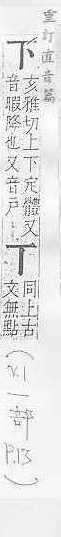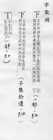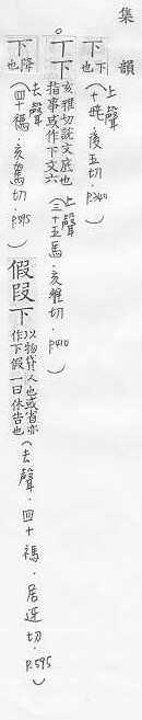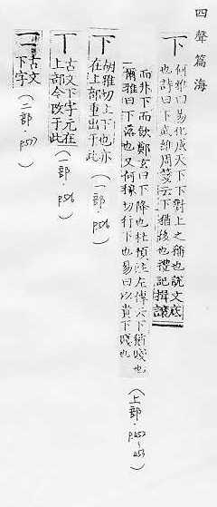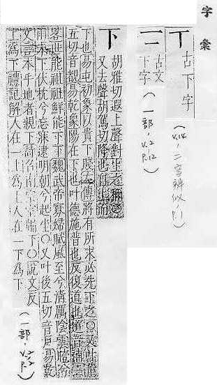 位置在低处的,与上相对:~层。~款。 等级低的:~级。~品。~乘(佛教用语,一般借指文学艺术的平庸境界或下品)。~里巴人(泛指通俗的普及的文学艺术,常与“阳春白雪”对举)。 方面,方位:两~都同意。 次序或时间在后的:~卷。~次。~限。 由高处往低处,降落:~山。~车。~马。~达。 使降落:~半旗。~棋。 进入:~海。 投送:~书。 到规定时间结束日常工作或学习:~班。~课。 谦辞:在~。~官。 颁布:~令。 攻克:攻~。 卸掉:~货。把他的枪~了。 用,投入精力:~工夫。 退让:争执不~。 做出判断:~结论。 量词,指动作次数:打三~。 用在名词后边(a.表示在里面,如“心~”、“言~”;b.表示当某个时节,如“节~”、“年~”)。 用在动词后边(a.表示关系,如“教导~”、“培养~”;b.表示完成或结果,如“打~基础”;c.与来、去连用表示趋向或继续,如“走~去”、“停~来”)。 少于:不~二百人。 动物生产:鸡~蛋。