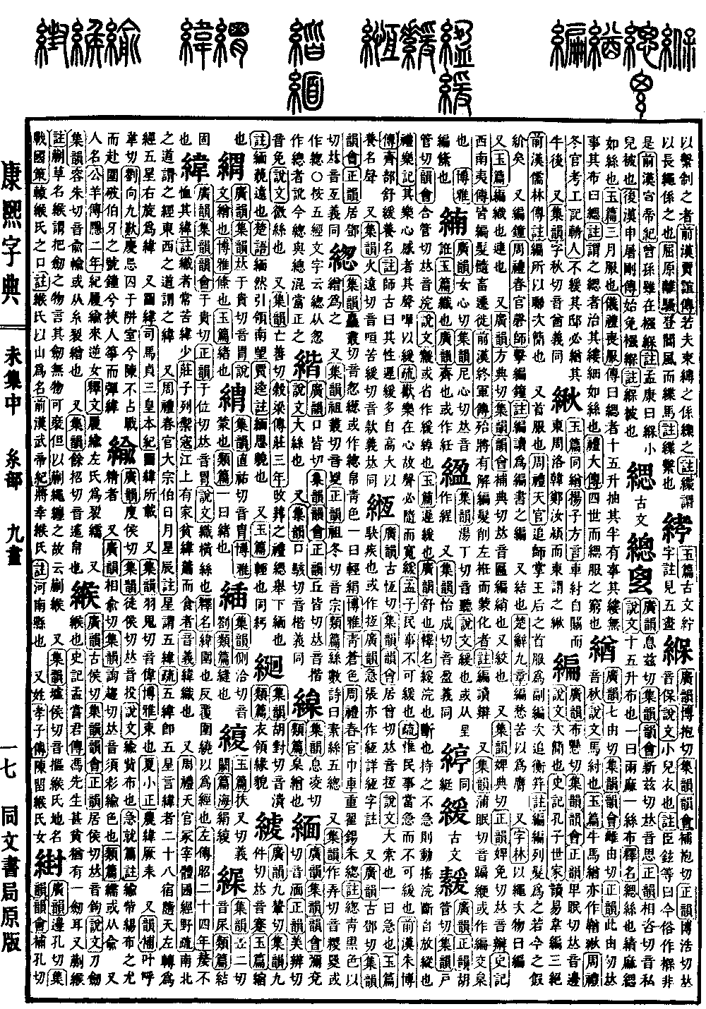 《集韵》麤丛切,音怱。繱或作緫。帛靑色。一曰轻绢。《博雅》靑也。《周礼·春官·巾车》重翟锡朱緫。《注》緫,靑黑色,以缯为之。 又《集韵》祖丛切,音㚇。《正韵》祖冬切,音宗。《类篇》丝数。诗曰:素丝五緫。 又《集韵》作弄切,音糉。䍟或作緫。○按五经文字云:緫从怱作总者讹。今緫与总混,当正之。*考证:〔《博雅》靑苍色。〕 谨照原文靑苍色改靑也。