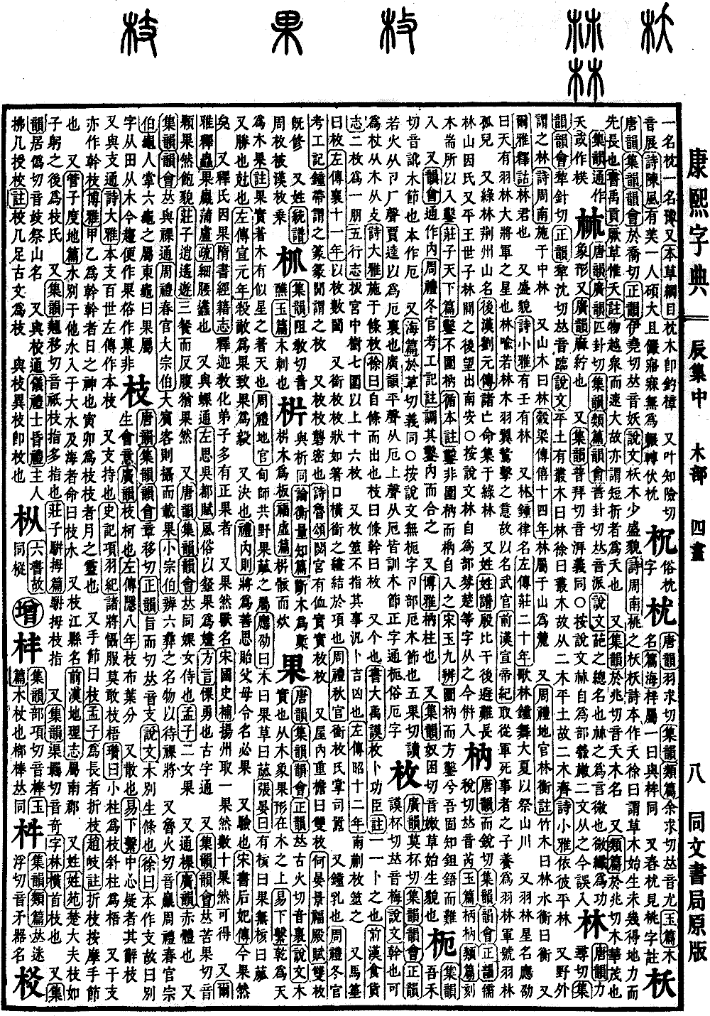 《唐韵》《集韵》《韵会》《正韵》𠀤古火切,音裹。《说文》木实也。从木,象果形在木之上。《易·说卦》干为天,为木果。《注》果实著木,有似星之著天也。《周礼·地官》甸师共野果蓏之属。《应劭曰》木曰果,草曰蓏。《张晏曰》有核曰果,无核曰蓏。又胜也,尅也。《左传·宣二年》杀敌为果,致果为毅。 又决也。《礼·内则》将为善思,贻父母令名必果。 又验也。《宋书·后妃传》今果然矣。 又释氏因果。《隋书·经籍志》释迦敎化弟子多有正果者。 又果然,兽名。《宋国史补》扬州取一果然,数十果然可得。 又《尔雅·释虫》果蠃,蒲卢。《疏》细腰蠭也。 又与惈通。《左思·吴都赋》风俗以韰果为婳。《方言》惈,勇也,古字通。 又《集韵》《韵会》𠀤苦果切。音颗。果然。饱貌。《庄子·逍遥游》三餐而反,腹犹果然。 又《唐韵》《集韵》《韵会》𠀤同婐。女侍也。《孟子》二女果。 又通裸。《广韵》赤体也。 又《集韵》《韵会》𠀤与祼通。《周礼·春官·大宗伯》大賔客则摄而载果。《小宗伯》辨六彝之名物,以待果将。 又鲁火切,音臝。《周礼·春官·宗伯》龟人掌六龟之属,东龟曰果属。字从田从木,今趋便作果,俗作菓,非。*考证:〔《易·下系》干为天,为木果。〕 谨照原文下系二字改为说卦。〔《左传·宣元年》〕 谨照原文元改二年。〔又与蜾通。《左思·吴都赋》风俗以韰果为婳。〕 谨照原文蜾改惈。〔《小宗伯》辨六彝之名物,以待祼将。〕 谨照原文祼改果。