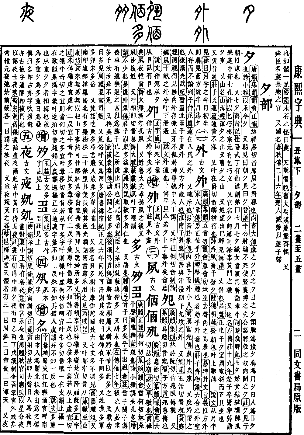 〔古文〕𡖄《广韵》《集韵》五会切《韵会》鱼会切,𠀤歪去声。内之对,表也。《易·坤卦文言》义以方外。《家人彖传》男正位乎外。《礼·祭义》礼也者,动于外者也。《庄子·齐物论》六合之外,圣人存而不论。《列子·仲尼篇》远在八荒之外。 又疏斥也。《易·泰卦彖传》内君子,而外小人。《前汉·霍光传》尽外我家。 又度外,置之也。《后汉·光武纪》暂置此两子于度外。 又方外,散人也。《淮南子·道应训》吾与汗漫期于九垓之外。 又《集韵》五活切,音杌。《黄庭经》洞视得见无内外,存嗽五牙不饥渴,神华执中六丁谒。 又叶征例切,音制。《诗·魏风》十亩之外兮。叶下泄逝。 《说文》外,远也。卜尚平旦,今若夕卜,于事外矣。会意。*考证:〔《礼·祭仪》礼也者,动乎外者也。〕 谨照原书祭仪改祭义。照原文动乎改动于。〔《易·否卦彖传》内君子,而外小人。〕 谨照原书否卦改泰卦。