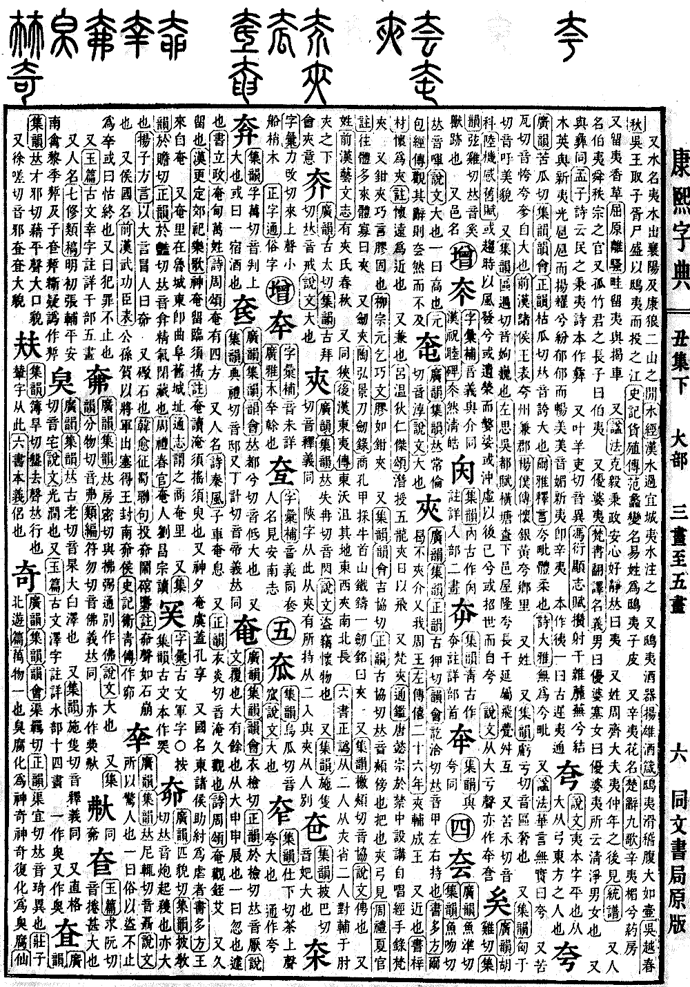 《广韵》苦瓜切《集韵》《韵会》《正韵》枯瓜切,𠀤音夸。大也。《尔雅·释言》夸毗,体柔也。《诗·大雅》无为夸毗。 又《諡法》华言无实曰夸。 又苦瓦切,音恗。夸奓,自大也。《前汉·诸侯王表》夸州兼郡。《杨仆传》怀银黄夸鄕里。 又姓。 又《集韵》亏亏切,音区。奢也。 又《集韵》匈于切,音吁。美貌。 又《集韵》区遇切,音姁。巍也。《左思·吴都赋》横塘查下,邑屋隆夸。长干延属,飞甍舛互。 又苦禾切,音科。《陆机·感旧赋》或趋时以风发兮,或遗荣而媻娑。或冲虚以后已兮,或招世而自夸。 《说文》从大亏声。亦作𡗢𧥢。