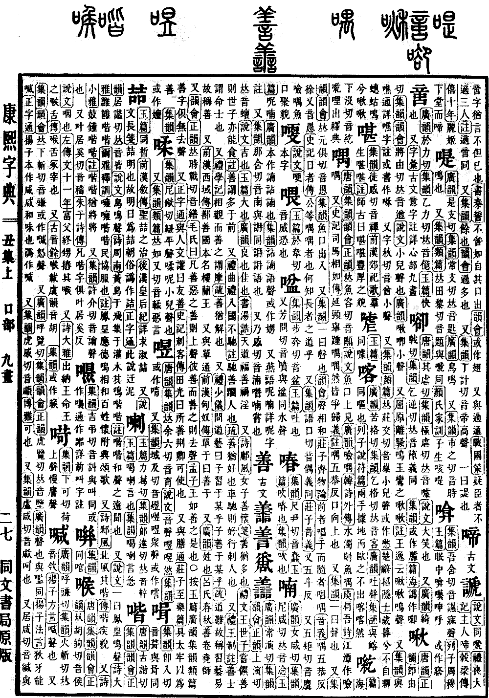 〔古文〕譱𦎍𠾄𧮟《广韵》常演切《集韵》《韵会》《正韵》上演切,𠀤音蟺。《说文》吉也。《玉篇》大也。《广韵》良也,佳也。《书·汤诰》天道福善祸淫。 又《诗·鄘风》女子善怀。《笺》善,犹多也。《礼·文王世子》尝馔善,则世子亦能食。《注》善谓多于前。 又《礼·曲礼·入国不驰注》驰善躙人也。《疏》善犹好也,车驰则好行刺人也。 又《礼·王制注》善士谓命士也。 又《礼·学记》相观而善之谓摩。《疏》善犹解也。 又《礼·少仪》问道艺,曰:子习于某乎,子善于某乎。《疏》道难,故称习。艺易,故称善。 又《前汉·西域传》鄯善国,本名楼兰王。 又与单通。《前汉·匈奴传》单于曰善于。 又《广韵》姓也。《吕氏春秋》善卷,尧师。 又《韵会》《正韵》𠀤时战切,音缮。《毛氏曰》凡善恶之善则上声,彼善而善之则去声。《孟子》王如善之是也。○按《玉篇》《广韵》《集韵》《类篇》善字俱无去声。 又《正字通》与人交讙曰友善。《史记·刺客传》田光曰:所善荆卿可使也。 又与膳通。《庄子·至乐篇》具太牢以为善。 《集韵》或作嬗。