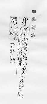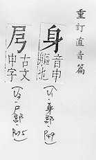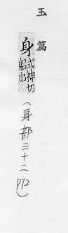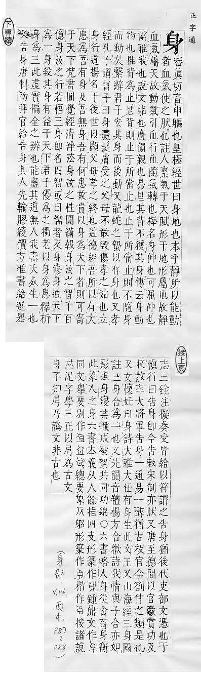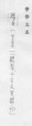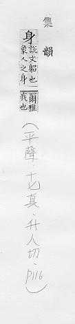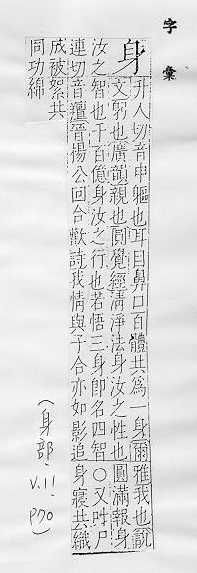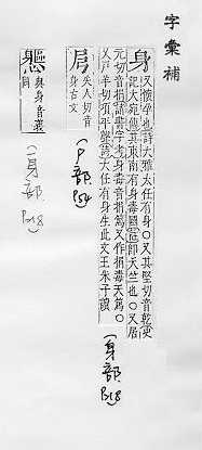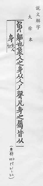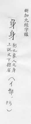 人、动物的躯体,物体的主要部分:~躯。人~。~材。~段。船~。树~。 指人的生命或一生:~世。献~。 亲自,本人:自~。亲~。~教。~体力行。 统指人的地位、品德:出~。~分(fèn )。~败名裂。 孕,娠:~孕。 量词,指整套衣服:做了一~儿新衣服。