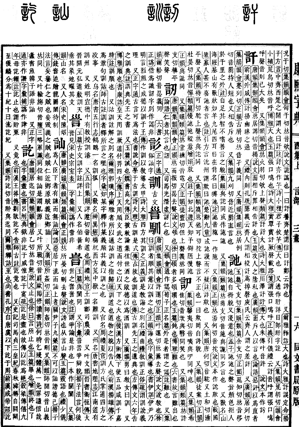 《唐韵》《广韵》《集韵》《类篇》《韵会》《正韵》𠀤所晏切,删去声。《说文》谤也。从言山声。《玉篇》毁语也。《礼·少仪》为人臣下者,有谏而无讪。《论语》恶居下流而讪上者。《关尹子·九药篇》不可以讪谤德已。《扬子·法言》妄誉,仁之贼也。妄毁,义之贼也。贼仁近鄕原,贼义近鄕讪。 又《广韵》所奸切《正韵》师奸切,𠀤音删。又《集韵》师闲切,音山。义𠀤同。 又叶输旃切,音羶。《三略军谶》同位相讪,是谓乱源。 又叶所战切,音扇。《欧阳修·读书诗》何时乞残体,万一免罪谴。信哉蠹书鱼,韩子语非讪。 又《正字通》亦作𧧚。《字汇补》譌作𧧪,非。