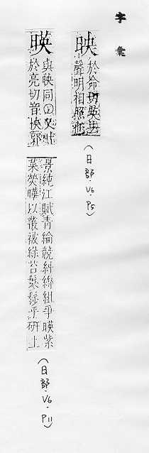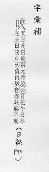 照射:~射。~照。 反照,照射而显示:反~(a.反照,反射;b.把容观事物表现出来;c.向上级转达,如“~~群众意见”)。~衬(映托使显现)。~雪读书(形容家贫而苦读)。