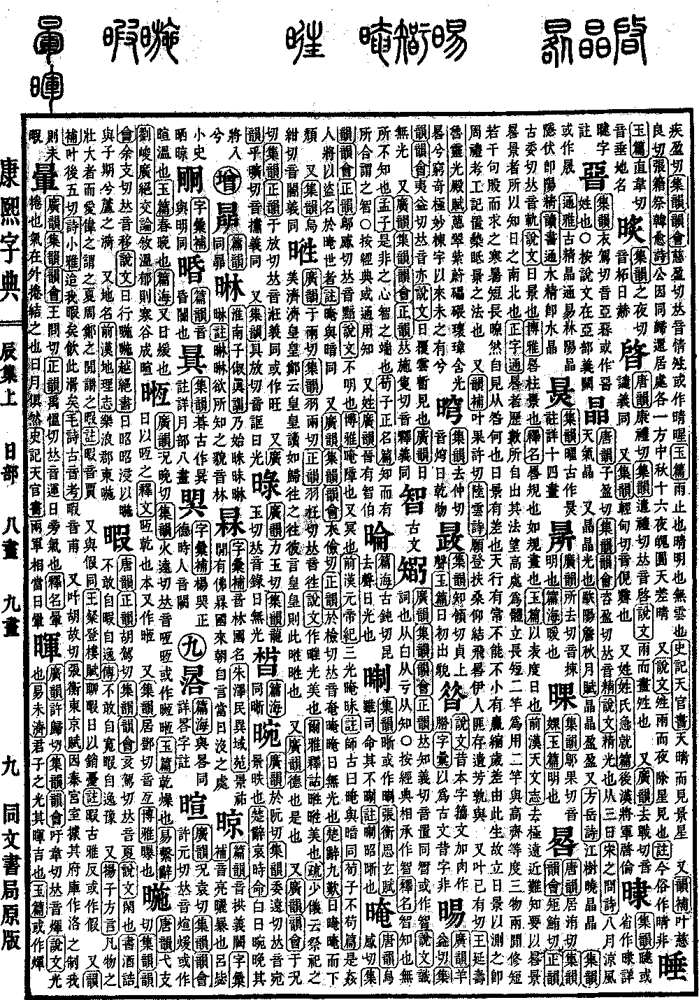 《唐韵》子盈切《集韵》《韵会》咨盈切,𠀤音精。《说文》精光也。从三日。《宋之问诗》八月凉风天气晶。 又晶晶,光也。《欧阳詹·秋月赋》晶晶盈盈。又《方岳诗》江树晓晶晶。 《集韵》或作晟。 《通雅》古精、晶通。《易林》阳晶隐伏,即阳精。《读书通》水精,即水晶。