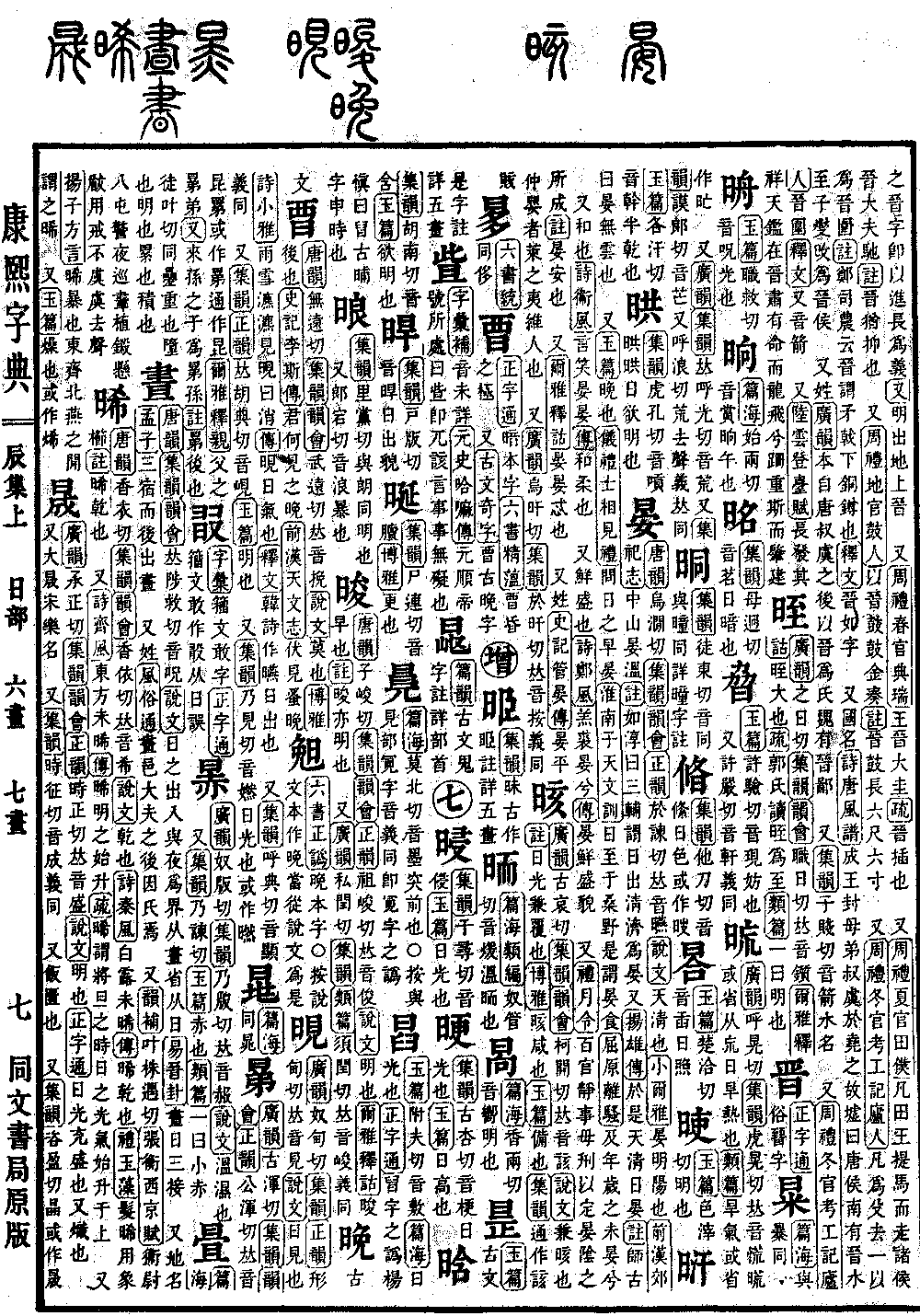 《正字通》俗㬜字。*(晋)《唐韵》《集韵》《韵会》𠀤即刃切。《说文》作㬜,进也,日出万物进也。《类篇》隶省作晋。《易·晋卦》晋,进也。《疏》以今释古,古之晋字,即以进长为义。《又》明出地上晋。 又《周礼·春官·典瑞》王晋大圭。《疏》晋,插也。 又《周礼·夏官·田仆》凡田,王提马而走,诸侯晋大夫驰。《注》晋,犹抑也。 又《周礼·地官·鼓人》以晋鼓鼓金奏。《注》晋鼓长六尺六寸。 又《周礼·冬官考工记·庐人》凡为殳,去一以为晋围。《注》郑司农云:晋谓矛戟下铜鐏也。《释文》晋如字。 又国名。《诗·唐风谱》成王封母弟叔虞于尧之故墟,曰唐侯。南有晋水,至子燮改为晋侯。 又姓。《广韵》本自唐叔虞之后,以晋为氏,魏有晋鄙。 又《集韵》子贱切,音箭。水名。 又《周礼·冬官考工记·庐人》晋围。《释文》又音箭。 又《陆云·登台赋》长发其祥,天鉴在晋。肃有命而龙飞兮,跚重斯而肇建。
