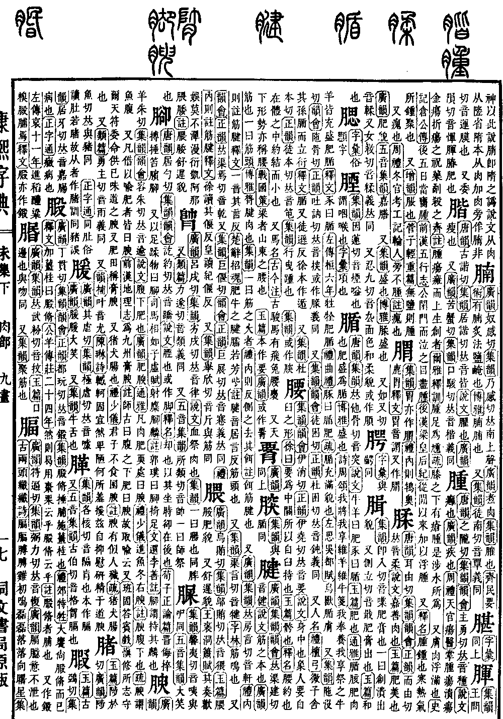 《集韵》《韵会》伊消切《正韵》伊尧切,𠀤音要。《说文》身中也。象人要自𦥑之形。《徐曰》要为中关,所以自𦥑持也。《玉篇》骻也。《释名》腰,约也,在体之中,约结而小也。 又马名。《古今注》古骏马有飞兔腰褭。 又天下形势亦称腰。《战国策》梁者,山东之腰也。 《玉篇》本作要。《广韵》或作𦝫。