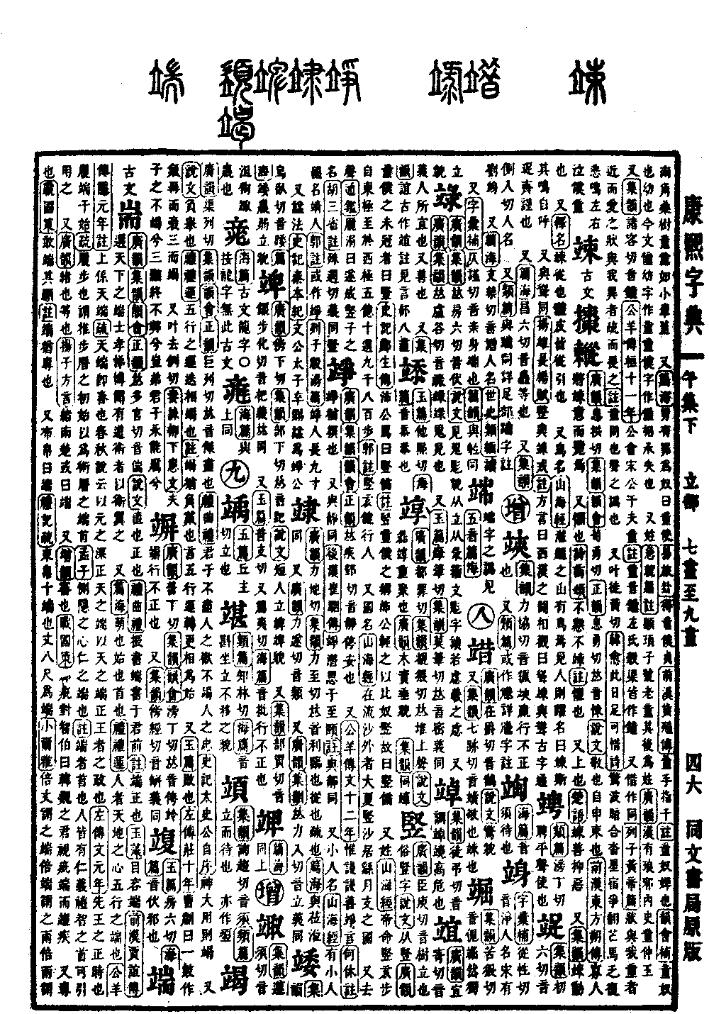 〔古文〕耑《广韵》《集韵》《韵会》《正韵》𠀤多官切,音偳。《说文》直也,正也。《礼·曲礼》振书端书于君前。《注》端,正也。《玉藻》目容端。《前汉·贾谊传》选天下之端士,孝悌博闻,有道术者,以衞翼之。 又《篇海》萌也,始也,首也。《礼·礼运》人者,天地之心,五行之端也。《公羊传·隐元年注》上系天端。《疏》天端,即春也。春秋说云:以元之深,正天之端。以天之端,正王者之政也。《左传·文元年》先王之正,时也,履端于始。《疏》履,步也,谓推步历之初始,以为术历之端首。《孟子》恻隐之心,仁之端也。《注》端者,首也。人皆有仁义礼智之首,可引用之。 又《广韵》绪也,等也。《扬子·方言》绪,南楚或曰端。 又《增韵》审也。《战国策》郤疵对智伯曰:韩魏之君,视疵端而趋疾。 又专也。《战国策》敢端其愿。《注》端,犹专也。 又布帛曰端。《礼·记疏》束帛,十端也。丈八尺为端。《小尔雅》倍丈谓之端,倍端谓之两,倍两谓之疋。 又《周礼·春官》其齐服有𤣥端,素端。《郑司农注》衣有襦裳者为端。《穀梁传·僖三年》桓公委端搢笏,而朝诸侯。《注》端,𤣥端之服。《疏》其色𤣥,而制正幅无杀,故谓之𤣥端。 又地名。《山海经》号山,端水出焉,东流注于河。又国在流沙中者,墩端玺㬇。《史记·赵世家》与韩魏分晋,封晋君以端氏。《注》端氏,泽州县也。《前汉·地理志》苍梧郡有端溪。 又姓。孔子弟子端木赐。 又宫门名。《后汉·黄琼传》举吏,先试之于公府,又覆之于端门。《注》端门,太微宫南门也。 又兽名。《后汉·鲜𤰞传》禽兽异于中国者,野马,原羊,角端牛,以角为弓,俗谓之角端弓。 又《正韵》尺兖切。与喘同。《荀子·劝学篇》端而言。《注》端,读为喘。喘,微言也。 又《韵会小补》美辨切。同冕。大夫以上冠也。《礼·玉藻》诸侯𤣥端以祭,天子𤣥端以朝,日于东门之外。《注》端,皆音冕。 又《韵补》叶都元切。《陆机·文赋》罄澄心以凝思,眇众虑而为言。笼天地于形内,挫万物于笔端。 又叶多汪切。《杨戏赞秦子敕》正方受遣,豫闻后纲。不𨻰不佥,造此异端。*考证:〔《礼·月令》诸侯玄端以祭,天子玄端以朝,日于东门之外。〕 谨照原文月令改玉藻。