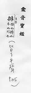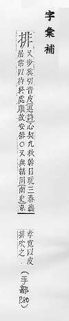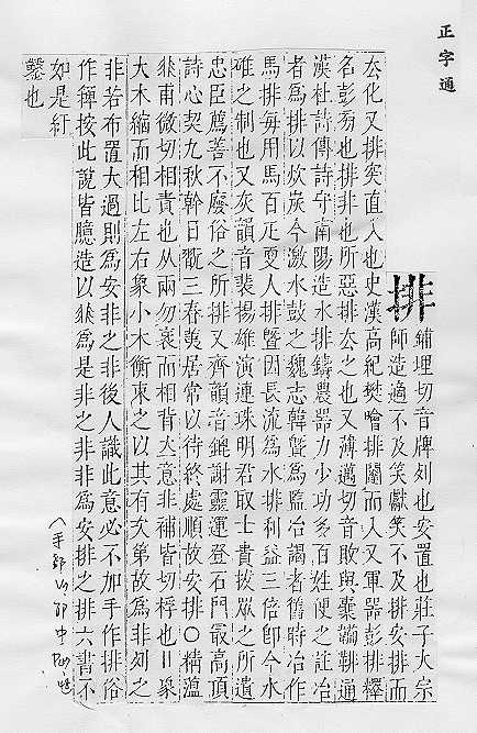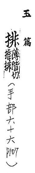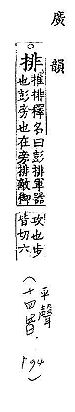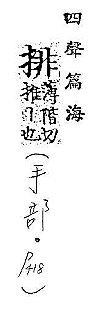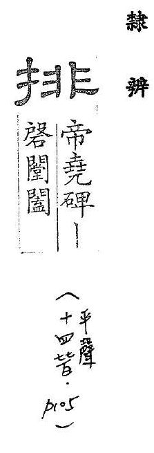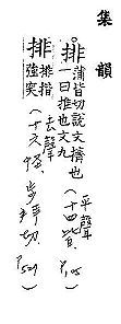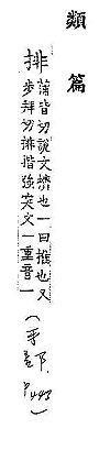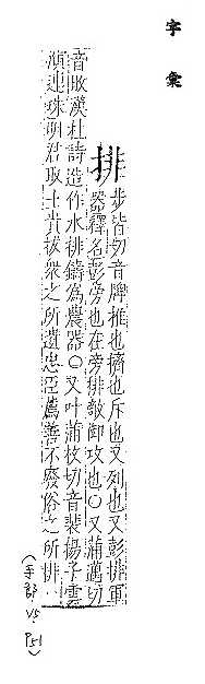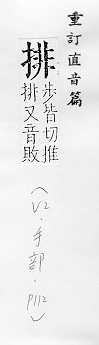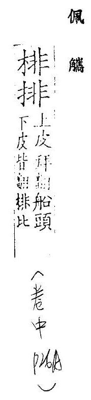除去,推开:~出。~斥。~水。~外。~挤。~山倒海。~忧解难。 摆成行列:~列。~队。~字。~印。~笔。~场。 排成的行列:~头。前~。 军队的编制单位,班的上一级。 练习演戏:~戏。 竹或木平摆着编扎成的水上交通工具:木~。竹~。~运。
