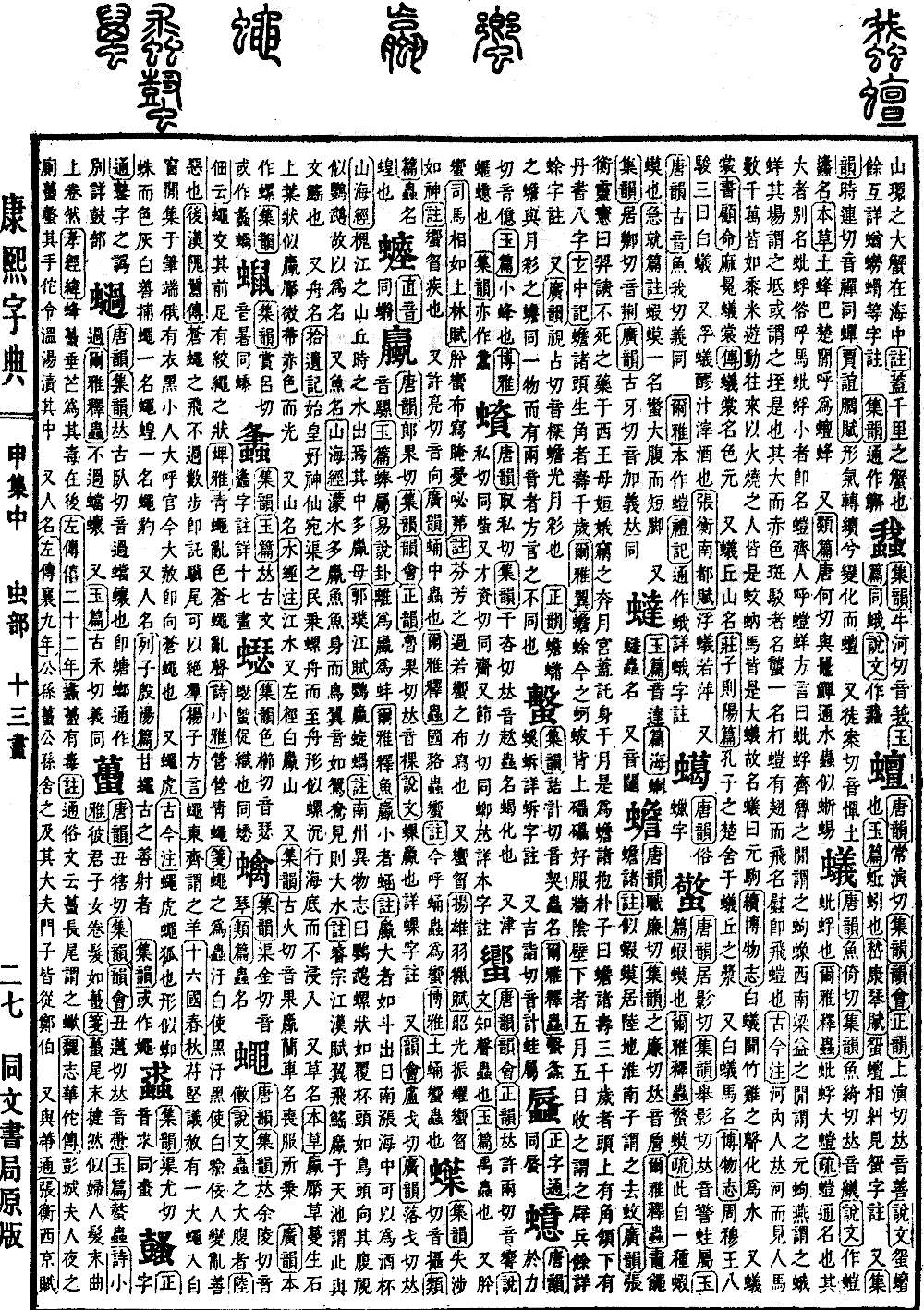 《唐韵》郞果切《集韵》《韵会》《正韵》鲁果切,𠀤音裸。《说文》蜾蠃也。详蜾字注。 又《韵会》卢戈切《广韵》落戈切,𠀤音骡。《玉篇》蜯属。《易·说卦》离为蠃为蚌。《尔雅·释鱼》蠃,小者蜬。《注》蠃,大者如斗,出日南涨海中,可以为酒杯。《山海经》槐江之山,丘时之水出焉,其中多蠃母。《郭璞·江赋》鹦蠃蜁蜗。《注》《南洲异物志》曰:鹦鹉螺,状如覆杯,头如鸟,头向其腹视似鹦鹉,故以为名。 又鱼名。《山海经》濛水多蠃鱼,鱼身而鸟翼,音如鸳鸯,见则大水。《注》《睿宗·江汉赋》翼飞鳐蠃于天池,谓此与文鳐也。 又舟名。《拾遗记》始皇好神仙,宛渠之民乗螺舟而至,舟形似螺,沉行海底而不浸入。 又草名。《本草》蠃厣草,蔓生石上,叶状似蠃厣,微带赤色而光。 又山名。《水经注》江水又左径白蠃山。 又《集韵》古火切,音果。蠃兰,车名,丧服所乗。 《广韵》本作螺。《集韵》或作蠡、蜗。