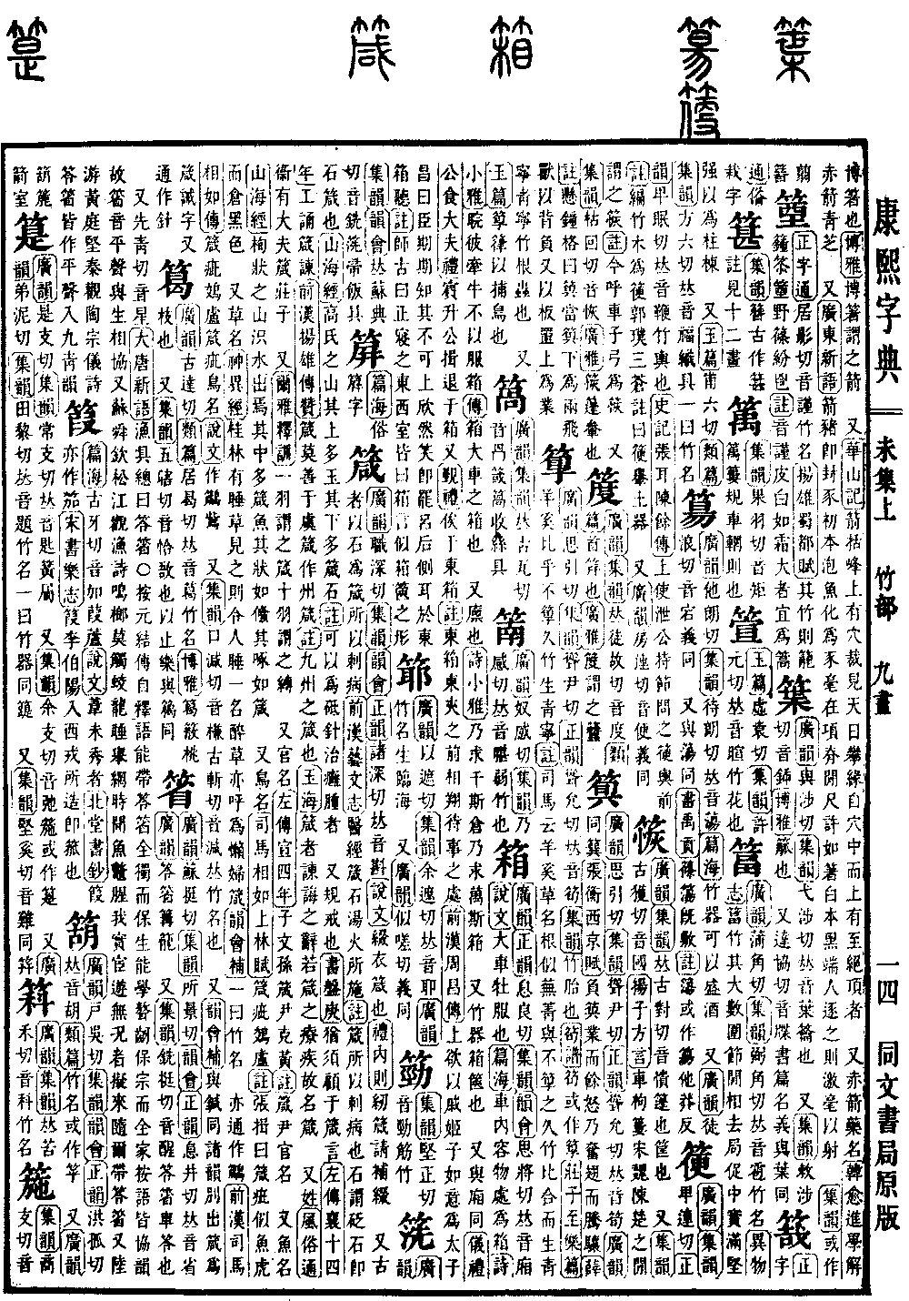 《广韵》《正韵》息良切《集韵》《韵会》思将切,𠀤音厢。《说文》大车牝服也。《篇海》车内容物处为箱。《诗·小雅》睆彼牵牛,不以服箱。《传》箱,大车之箱也。 又廪也。《诗·小雅》乃求千斯仓,乃求万斯箱。 又竹器,箱箧也。 又与厢同。《仪礼·公食大夫礼》賔升,公揖退于箱。又《觐礼》几俟于东箱。《注》东箱,东夹之前相翔待事之处。《前汉·周昌传》上欲以戚姬子如意为太子,昌曰:臣期期知其不可。上欣然笑,即罢。吕后侧耳于东箱听。《注》师古曰:正寝之东、西室皆曰箱,言似箱箧之形。*考证:〔《说文》大车牡服也。〕 谨照原文牡改牝。〔《觐礼》俟于东箱。〕 谨照原文俟上增几字。
