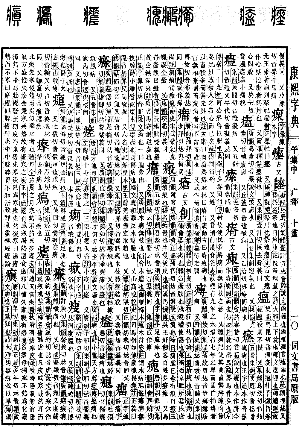 《唐韵》都年切《集韵》《韵会》《正韵》多年切,𠀤音顚。《说文》病也。《玉篇》狂也。《诗·大雅》胡宁瘨我以旱。《传》瘨,病也。《战国策》瘨而殚闷。《注》瘨,狂也,殚气绝也。 又通作塡。《诗·小雅》哀我塡寡。《朱传》病也。与瘨同。 又《说文》一曰腹张。 又《字汇补》与𠑘同。倒也。扬雄瘨痃。 又《集韵》《韵会》《正韵》𠀤徒典切,音殄。又《集韵》丁练切,音殿。又亭年切,音田。又之刃切,音震。义𠀤同。 又《集韵》称人切,音𦗀,腹胀病。