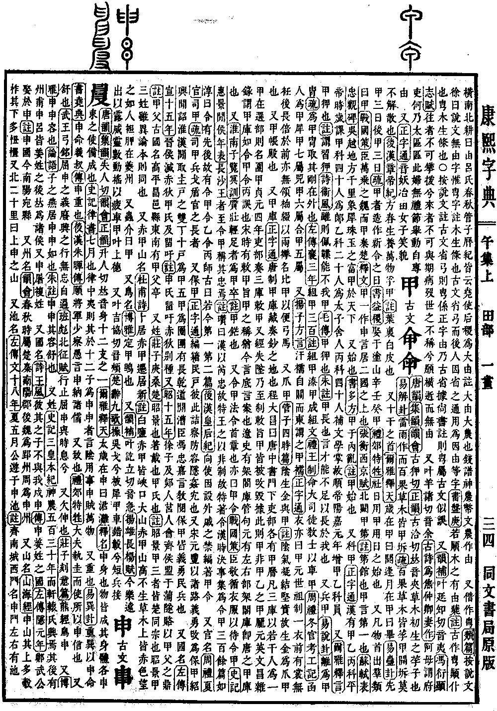 〔古文〕𠇚𡴌《唐韵》《集韵》《韵会》古狎切《正韵》古洽切,𠀤音夹。草木初生之莩子也。《易·解卦》雷雨作而百果草木皆甲坼。《疏》百果草木皆莩甲开坼,莫不解散也。《后汉·章帝纪》方春生养,万物孚甲。《注》叶里白皮也。 又十干之首。《尔雅·释天》岁在甲曰阏逢,月在甲曰毕。《易·蛊卦》先甲三日,后甲三日。《疏》甲者,造作新令之日。《书·益稷》娶于涂山,辛壬癸甲。《礼·郊特牲》社日用甲,用日之始也。 又凡物首出羣类曰甲。《战国策》臣万乗之魏,而甲秦楚。《释文》甲,一作申,言居二国之上也。《张衡·西京赋》北阙甲第。《注》第,馆也。甲,言第一也。《苏轼·表忠观𥓓》吴越地方千里,象犀珠玉之富甲于天下。 又始也。《书·多方》因甲于内乱。《注》甲,始也。 又科甲。《正字通》汉有甲乙丙科,平帝时岁课甲科四十人为郞,乙科二十人为太子舍人,丙科四十人补文学掌故。顺帝阳嘉元年,增甲乙科员。 又《尔雅·释言》甲,狎也。《注》谓习狎。《诗·衞风》虽则佩韘,能不我甲。《毛传》甲,狎也。《朱注》甲,长也。言才能不足以长于我也。 又兵甲。《易·说卦》离为甲冑。《疏》为甲冑,取其刚在外也。《左传·襄三年》组甲三百。《注》组甲,漆甲成组文。《礼·王制》命大司徒敎士以车甲。《周礼·冬官考工记》函人为甲,犀甲七属,兕甲六属,合甲五属。 又《扬子·方言》汗襦,自关而东谓之甲𥜗。《正字通》衣亦曰甲,元世祖制一衣,前有裳无衽,后长倍于前,亦无领袖,缀以雨襻,名比甲,以便弓马。 又爪甲。《管子·四时篇》隂生金与甲。《注》隂气凝结坚实,故生金为爪甲也。 又甲帐,殿也。 又甲库。《正字通》唐制,甲库,藏奏钞之地也。程大昌曰:唐中书门下吏部,各有甲历,凡三库以若干人为一甲,在选部则名团甲。贞元四年,吏部奏三库敕甲,又经失坠,乃至制敕旨甲皆被攺毁。据此则甲非甲乙之甲。厐元英文昌杂录谓甲库如令甲令丙,误也。宋时有敕甲旨甲之称,犹今言底言案也。辽史有架阁库管句,元有左右部架阁库,即唐之甲库也。 又《淮南子·览冥训》质壮轻足者为甲卒。《注》甲铓也。 又令甲,法令首章也。亦曰甲令。《战国策》臣敬循衣服以待令甲。《史记·惠景闲侯年表》长沙王者至令甲,称其忠焉。《注》瓒曰:汉以芮忠故特王之。以非制,故特着令。汉时决事,集为令甲三百余篇。如淳曰:令有先后,故有令甲,令乙,令丙。师古曰:若今第一,第二篇。《后汉·皇后纪》向使因设外戚之禁,编著甲令。 又官名。《周礼·夏官》司甲。《疏》司甲,兵戈盾官之长者。 又保甲。《正字通》编籍民戸,彼此诘察,防容隐奸宄也。又宋元丰,以诸路义勇攺为保甲。绍兴闲诏淮汉闲,取主戸之双丁,十戸为甲,五甲为团,团有长。乾道闲,漕臣冯忠嘉言敎阅保甲,皆义勇民兵也。 又国名。《春秋·宣十六年》晋人灭赤狄甲氏及留吁。《注》甲氏留吁,赤狄别种。《传·昭十六年》徐子及郯人莒人会齐侯盟于蒲隧,赂以甲父之鼎。《注》甲父,古国名。高平昌邑县东南有甲父亭。 又姓。《庄子·庚桑楚》昭景也,甲氏也。《释文》一说昭景甲三者,皆楚同宗也。昭景甲,三姓虽异,论本则同也。 又赤甲,山名。《杜甫诗》卜居赤甲迁居新。《注》白盐,赤甲,皆峡口大山。赤甲山高,不生草木,上皆赤色,望之如人袒胛,在夔州。 又虫介曰甲。 又鸟名。《博雅》定甲鴠也。 又《韵补》叶讫立切,音急。《扬雄·长杨赋》今乐远出以露威灵,数动摇以疲车甲。叶上德。 又叶吉协切,音颊。《楚辞·九歌》操吴戈兮被犀甲,车错毂兮短兵接。*考证:〔《书·多方》甲于内乱。〕 谨照原文甲字上增因字。〔《左传·宣十五年》晋侯灭赤狄甲氏及留吁。又《昭十五年》徐子及郯人莒人会齐侯盟于蒲隧,赂以甲父之鼎。〕 谨照原书左传改春秋。昭字上又字改为传字。两十五年俱照原文改为十六年。晋侯改晋人。〔《庄子·庚桑楚》昭景也,著戴也,甲氏也。《注》昭景甲三者,皆楚同宗也。〕 谨照原文甲氏也下连着封也为句,言昭景以戴而著甲氏以封而著也。今按义谨省著戴也三字。注改为释文一说。