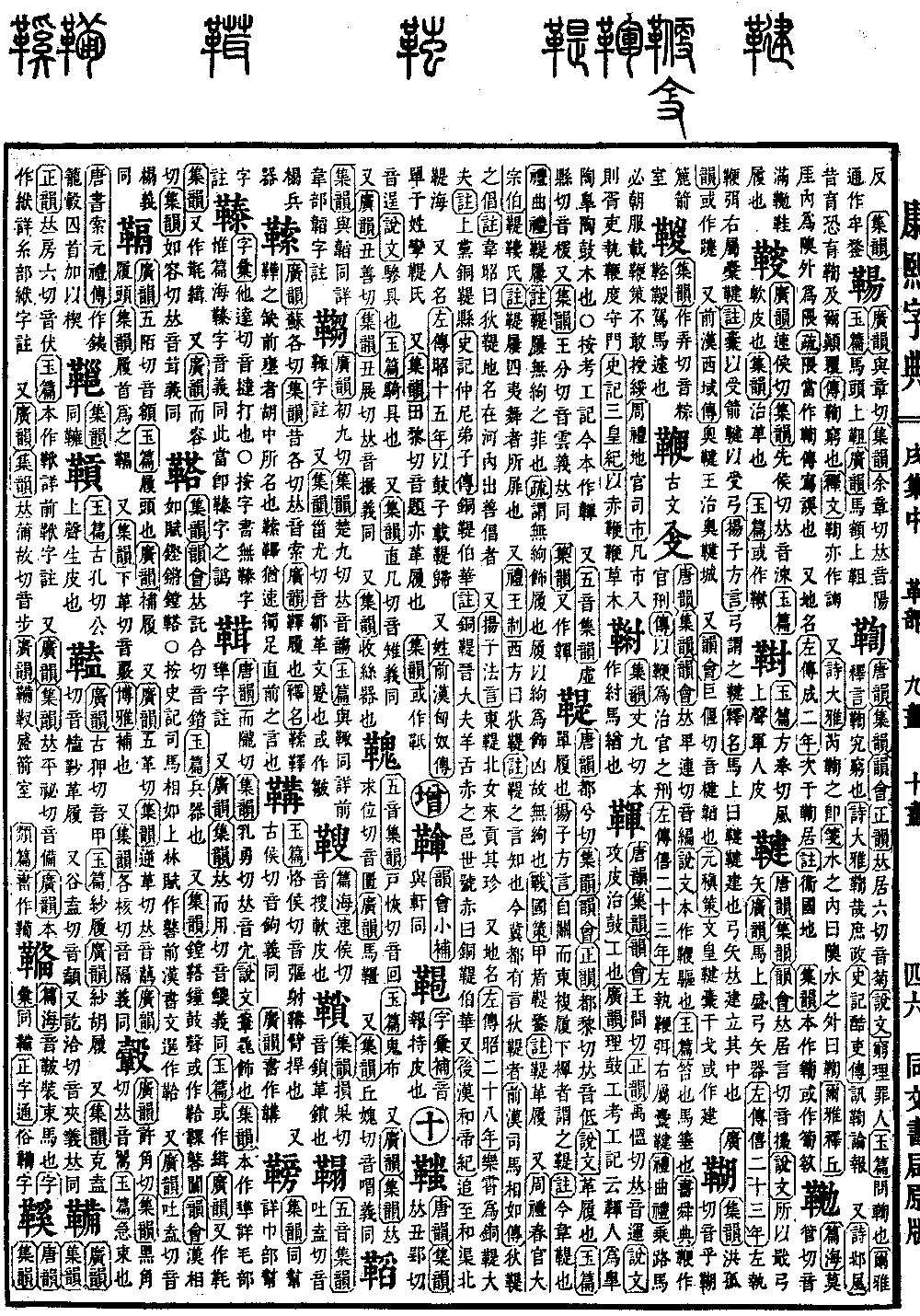 《唐韵》《集韵》《韵会》𠀤居言切,音𢳚。《说文》所以戢弓矢。《广韵》马上盛弓矢器。《左传·僖二十三年》左执鞭弭,右属櫜鞬。《注》櫜以受箭,鞬以受弓。《扬子·方言》弓谓之鞬。《释名》马上曰鞬。鞬,建也。弓矢𠀤建立其中也。 《广韵》或作𨇥。 又《前汉·西域传》奥鞬王治奥鞬城。 又《韵会》巨偃切,音楗。韬也。《元稹策》文皇鞬櫜干戈。或作建。