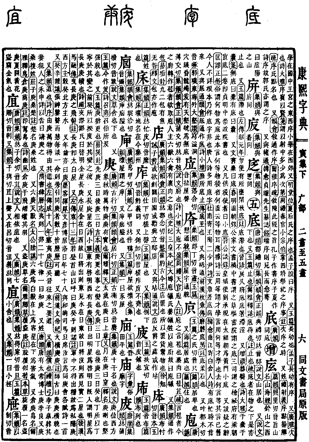 《唐韵》都礼切《集韵》《韵会》《正韵》典礼切,𠀤音邸。《说文》山居也。 又《说文》下也。又《玉篇》止也。《尔雅·释诂》底,待也。《注》止也。《疏》底者,在物之下,是亦止也。 又《玉篇》滞也。《左传·昭元年》勿使有所壅闭湫底。《注》底,滞也。《晋语》戾久将底,底箸滞淫。 又《增韵》器臀也。《诗·大雅》于橐于囊。《笺》无底曰橐。有底曰囊。 又文书槀曰底。《春明退朝录》公家文书稿,中书谓之草,枢密院谓之底,三司谓之检。祕府有梁朝宣底二卷,即贞明中崇政院书也。 又凡供役使者曰小底。《晋公谈录》皇城使刘承规,在太祖朝为黄门小底。 又设疑之辞。《匡谬正俗》俗谓何物为底。此本言何等物,后省何,直云等物耳。应璩诗云:用等谓才学,言用何等才学也。去何言等,其言已旧,今人不详根本,乃作底字,非也。唐人诗多用底字。《杜甫·寄王陶二少尹诗》文章差底病。《韩愈·曲江寄白舍人诗》有底忙时不肯来。 又与厎通。《韵会》厎,通作底。《诗·小雅》靡所底止。《传》底,至也。 又与砥通。《前汉·枚乗传》磨砻底厉。《注》底,柔石也。 又叶都木切,音啄。《郭璞·东海外大壑赞》写溢洞穴,暵昏龙烛。爰有天壑,号为无底。
