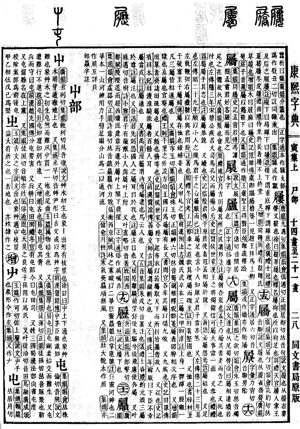 《集韵》《韵会》𠀤株伦切,音肫。《说文》难也。象艸木之初生,屯然而难。从屮贯一。一,地也,尾曲。《玉篇》万物始生也。 又《广韵》厚也。《易·屯卦》屯,刚柔始交而难生。 又屯邅,难行不进貌。《易·屯卦》屯如邅如。别作迍。 又《增韵》吝也。《易·屯卦》屯其膏。 又《广韵》《集韵》徒浑切《正韵》徒孙切,𠀤音豚。聚也,勒兵而守曰屯。《前汉·赵充国传》分屯要害。 又兵耕曰屯田。《周礼·冬官》有屯部,今曰屯田司。 又姓,三国蜀汉法部尚书屯度。 又屯留,县名,在上党。 又《集韵》徒困切,音顿。亦姓。《风俗通》混屯,太昊之良佐,子孙因以为氏。 又叶徒沿切,音田。《马融·广成颂》校队案部,为前后屯。甲乙相伍,戊己为坚。