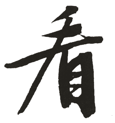 (会意。小篆字形,上面是“手”字的变形,下面是“目”,意思是用手遮住眼睛远望。本义:用手加额遮目而远望)