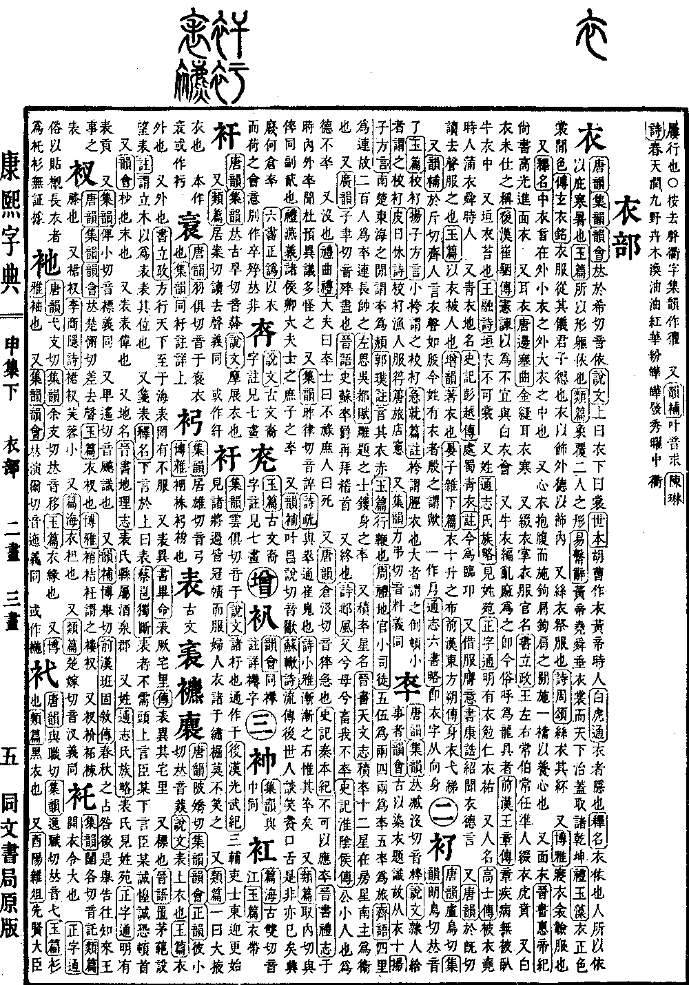 《唐韵》《集韵》《韵会》𠀤于希切,音依。《说文》上曰衣,下曰裳。《世本》胡曹作衣。黄帝时人。《白虎通》衣者,隐也。《释名》衣,依也。人所以依以庇寒暑也。《玉篇》所以形躯依也。《类篇》象覆二人之形。《易·系辞》黄帝、尧、舜垂衣裳,而天下治,盖取诸乾坤。《礼·玉藻》衣,正色。裳,闲色。《傅𤣥·衣铭》衣服从其仪,君子德也。衣以饰外,德以饰内。 又丝衣,祭服也。《诗·周额》丝衣其紑。 又《博雅》寝衣,衾,𩏩服也。 又《释名》中衣,言在外小衣之外,大衣之中也。 又心衣,抱腹而施钩肩,钩肩之闲施一裆,以养心也。 又面衣。《晋书·惠帝纪》尚书高光进面衣。 又耳衣。《唐·边塞曲》金缝耳衣寒。 又缀衣,掌衣服官名。《书·立政》王左右常伯、常任、准人、缀衣、虎贲。 又白衣,未仕之称。《后汉·崔骃传》宪谏以为不宜与白衣会。 又牛衣,编乱麻为之。即今俗呼为龙具者。《前汉·王章传》章疾病,无被,卧牛衣中。 又垣衣,苔也。《王融诗》垣衣不可裳。 又姓。《通志·氏族略》见《姓苑》。《正字通》明有衣勉仁、衣祐。 又人名。《高士传》被衣,尧时人。蒲衣,舜时人。 又靑衣,地名。《史记·彭越传》处蜀靑衣。《注》今为临卭。 又借服膺意。《书·康诰》绍闻衣德言。 又《唐韵》于既切,读去声。服之也。《玉篇》以衣被人也。《增韵》着衣也。《晏子·杂下篇》衣十升之布。《前汉·东方朔传》身衣弋绨。 又《韵补》于斤切。齐人言衣声如殷,今姓有衣者,殷之谓欤。 一作㐆。《通志·六书略》即衣字,从向、身。*考证:〔《正字通》明有衣勉仁,衣𧙗。〕 谨照原文𧙗改祐。