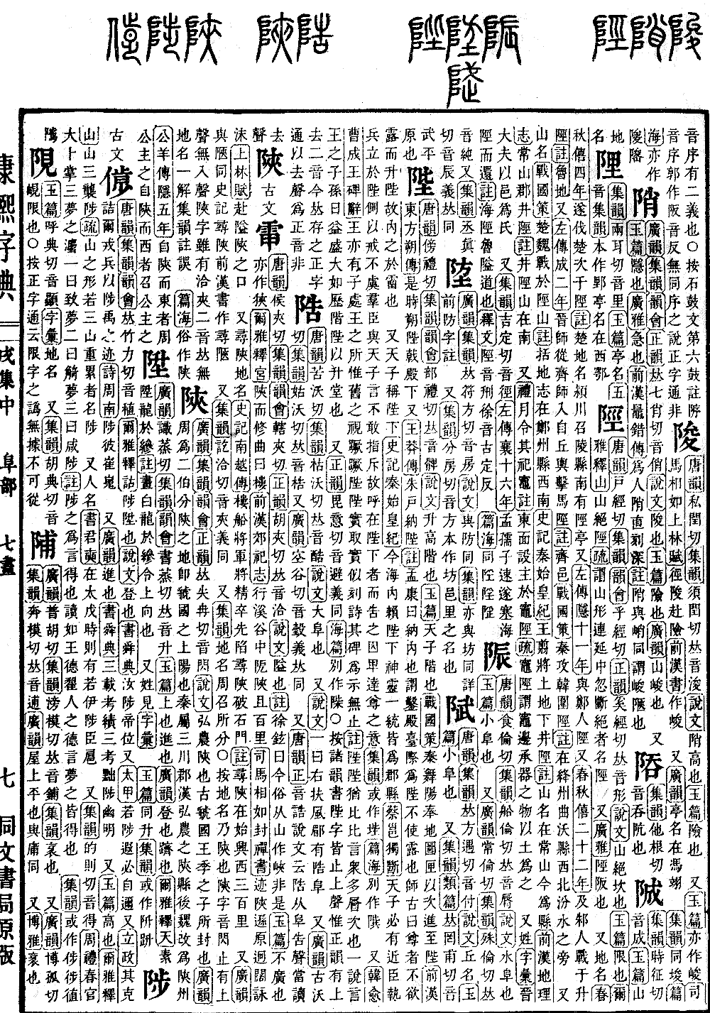 〔古文〕𠌹《广韵》《集韵》《韵会》𠀤竹力切,音稙。《尔雅·释诂》陟,升也。《说文》登也。《书·舜典》汝陟帝位。又《太甲》若陟遐,必自迩。又《立政》其克诘尔戎兵,以陟禹之迹。《诗·周南》陟彼崔嵬。 又《广韵》进也。《书·舜典》三载考绩,三考黜陟幽明。 又《玉篇》高也。《尔雅·释山》山三袭陟。《疏》山之形若三山重累者名陟。 又人名。《书·君奭》在太戊时则有若伊陟臣扈。 又《集韵》的则切,音得。《周礼·春官》大卜掌三梦之灋,一曰致梦,二曰觭梦,三曰咸陟。《注》陟之为言得也。读如王德翟人之德。言梦之皆得也。 《集韵》或作𠉡徏徝骘。