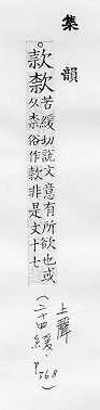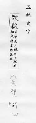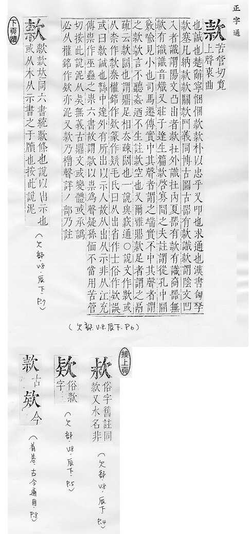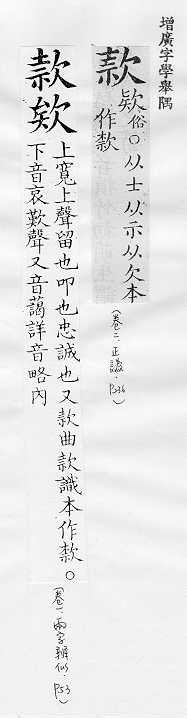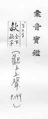 诚恳:~留。~曲(qū)(殷勤的心意)。~待。~洽(亲切融洽)。~诚。~语(恳切谈话)。 器物上刻的字,书画、信件头尾上的名字:落~(题写名字)。题~。 式样:~式。 法规条文里分的项目:条~。第三条第一~。 经费,钱财:~项。~额。公~。存~。汇~。 敲打,叩:~门。~打。~塞。~关而入。 至:“绕黄山而~牛首”。 留,招待:~客。 空:“~言不听,奸乃不生”。 缓慢:~步。~~。
