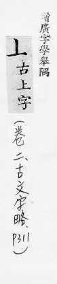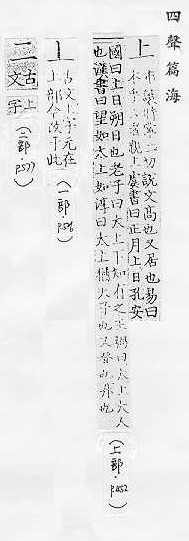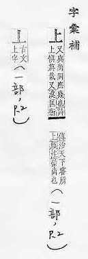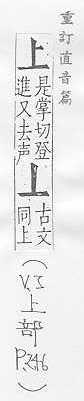 位置在高处的,与下相对:楼~。~边。 次序或时间在前的:~古。~卷。 等级和质量高的:~等。~策。~乘(佛教用语,一般借指文学艺术的高妙境界或上品)。 由低处到高处:~山。~车。~升。 去,到:~街。 向前进:冲~去。 增加:~水。 安装,连缀:~刺刀。~鞋(亦作“绱鞋”)。 涂:~药。 按规定时间进行或参加某种活动:~课。~班。 拧紧发条:~弦。 登载,记:~账。 用在名词后边,表示时间、处所、范围:晚~。桌~。组织~。 用在动词后边,表示开始、继续、趋向、完成:爬~来。锁~。选~代表。 达到一定的程度或数量:~年纪。 中国古代乐谱的记音符号,相当于简谱中的“1”。