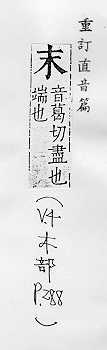 尖端,梢:~梢。~端。秋毫之~(毫毛尖端)。 最后,终了:~了(liǎo )。~尾。~日。~代。穷途~路。 非根本的,次要的,差一等的:~业。~技。舍本逐~。 碎屑:~子。碎~。 传统戏剧角色名,一般扮演中年以上男子:正~。副~。外~。~本(以男角主唱的杂剧)。