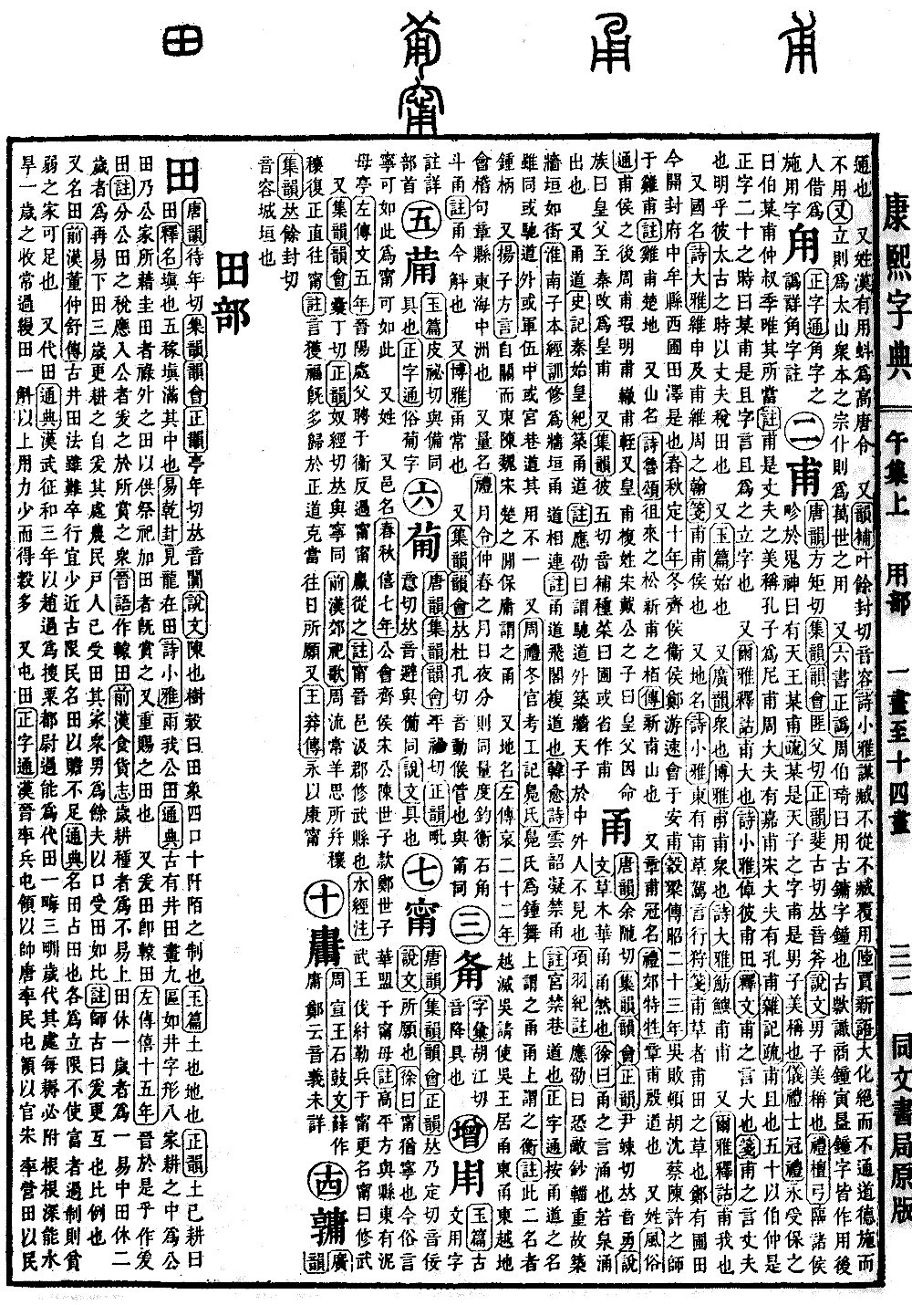 《唐韵》方矩切《集韵》《韵会》匪父切《正韵》斐古切,𠀤音斧。《说文》男子美称也。《礼·檀弓》临诸侯畛于鬼神曰:有天王某甫。《疏》某是天子之字,甫是男子美称也。《仪礼·士冠礼》永受保之,曰伯某甫仲叔季,唯其所当。《注》甫是丈夫之美称。孔子为尼甫,周大夫有嘉甫,宋大夫有孔甫。《杂记疏》甫,且也。五十以伯仲,是正字。二十之时曰某甫,是且字。言且为之立字也。 又《尔雅·释诂》甫,大也。《诗·小雅》倬彼甫田。传甫田谓天下田。《笺》甫之言丈夫也。明乎彼太古之时,以丈夫税田也。 又《玉篇》始也。 又《广韵》众也。《博雅》甫甫,众也。《诗·大雅》鲂𫚈甫甫。 又《尔雅·释诂》甫,我也。 又国名。《诗·大雅》维申及甫,维周之翰。《笺》甫甫,侯也。 又地名。《诗·小雅》东有甫草,驾言行狩。《笺》甫草者,甫田之草也。郑有圃田,今开封府中牟县西圃田泽是也。《春秋·定十年》冬,齐侯衞侯郑游速,会于安甫。《穀梁传·昭二十三年》吴败顿胡沈蔡𨻰许之师于鸡甫。《注》鸡甫,楚地。 又山名。《诗·鲁颂》徂来之松,新甫之栢。《传》新甫,山也。 又章甫,冠名。《礼·郊特牲》章甫,殷道也。 又姓。《风俗通》甫侯之后,周甫瑕,明甫辙,甫轾。又皇甫,复姓。宋戴公之子曰皇父,因命族曰皇父。至秦攺为皇甫。 又《集韵》彼五切,音补。种菜曰圃,或省作甫。*考证:〔《释文》甫之言大也。〕 谨按释文甫之言大也即郑笺,别本已引郑笺可以不引别本,谨改为传甫田谓天下田。