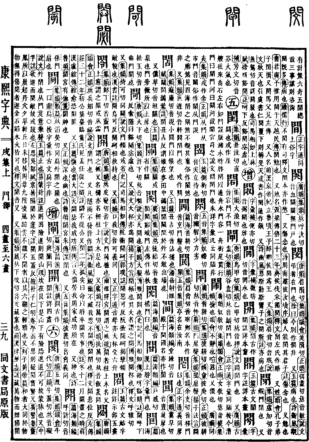 《唐韵》火下切《集韵》许下切,𠀤音㗿。《说文》大开也。《广韵》大裂。《博雅》閜,开也。《史记·司马相如传》谽呀豁閜。《注》閜,呼下反。索隐曰:豁閜,空虚也。 又《说文》大杯亦为閜。《扬子·方言》閜,桮也,其大者谓之閜。《博雅》閜,杯也。《释文》呼雅切。又《集韵》倚可切。同𨵌。《说文》门倾也。或省。《史记·司马相如传》阬衡閜砢。《郭璞注》閜,恶可反。阬衡閜砢揭孽倾敌貌也。《汉书注》閜,乌可反。閜砢,相抉持也。 又《集韵》口我切,音可。义同。 又《正字通》音斝。亦大杯,受六升。