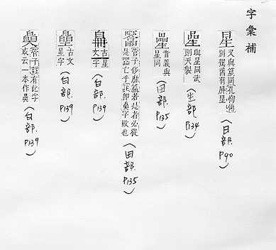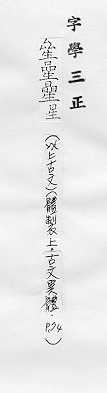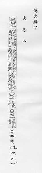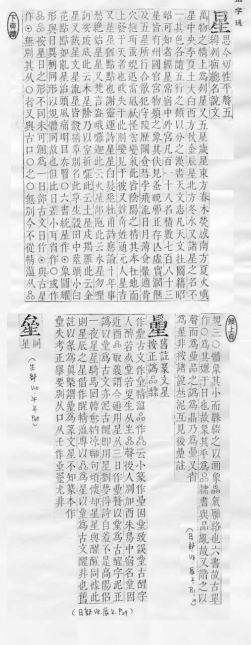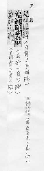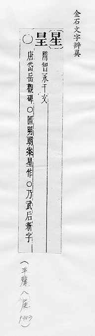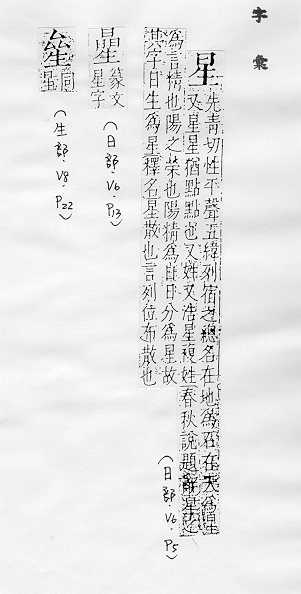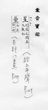 天文学上指宇宙间能发光的或反射光的天体;一般指夜间天空中发光的天体:~球。恒~。行(xíng )~。卫~。披~戴月。 细碎的小颗粒东西:火~儿。 秤等衡器上记数的点:定盘~。 军官衣领上的徽记:五~将军。 形容夜间:~行。~奔。 星名,二十八宿之一:~宿。 像星一样排列,分散:~~点点。 喻某一方面新出现的杰出人物:影~。歌~。 古代妇女面上所饰的花点。 以星象推算吉凶祸福的方术:~术。~相(xiàng )。 原子核物理学上指高能粒子射入核乳胶或云室、气泡室时发现有许多径迹从一点发出的现象。 国际通用的衡量宾馆、饭店的等级标准:~级。五~饭店。