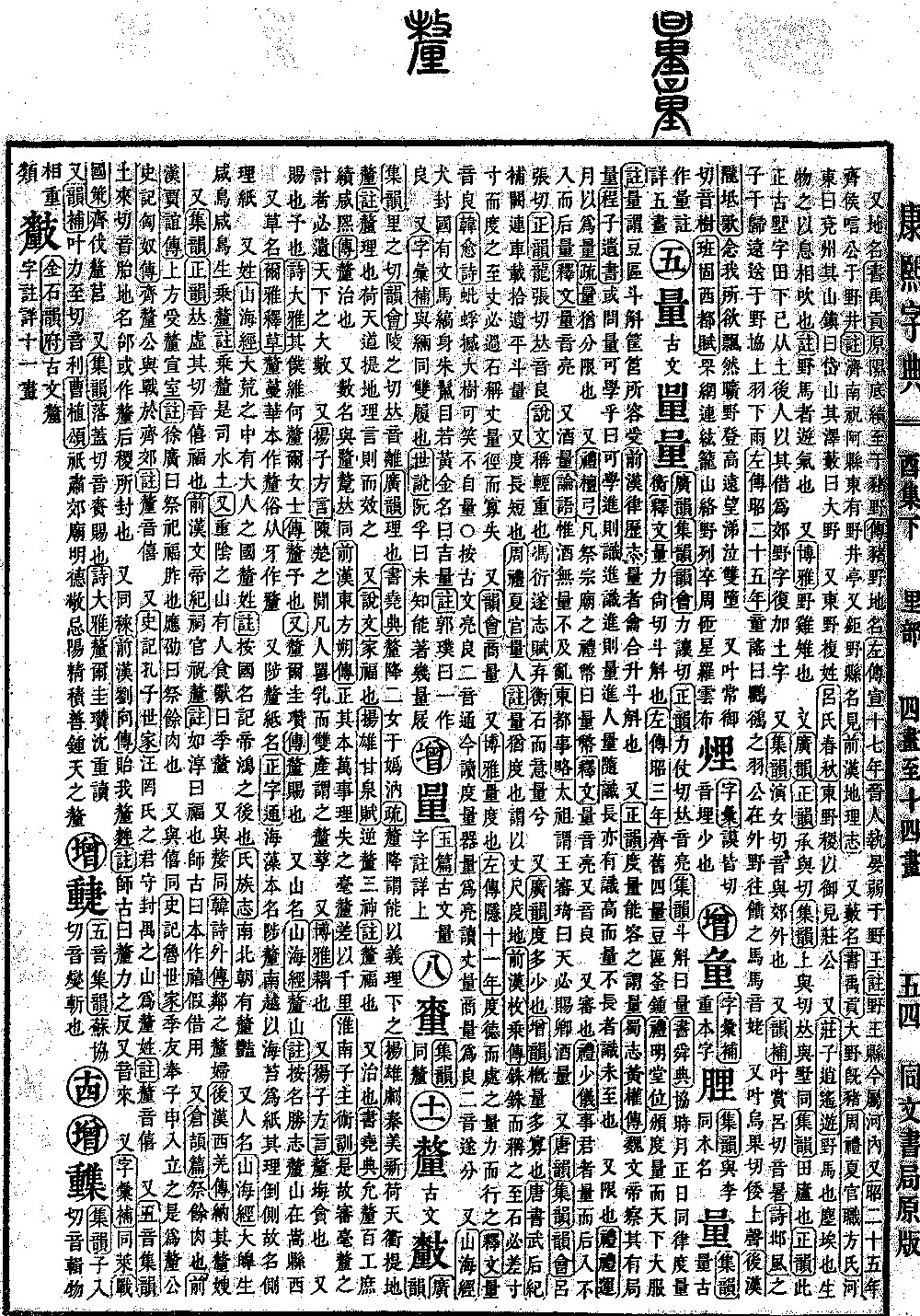 〔古文〕𨤦𨤥《广韵》《集韵》《韵会》力让切《正韵》力仗切,𠀤音亮。《集韵》斗斛曰量。《书·舜典》协时月正日,同律度量衡。《释文》量,力尚切,斗斛也。《左传·昭三年》齐旧四量,豆区釜钟。《礼·明堂位》颁度量,而天下大服。《注》量,谓豆、区、斗、斛、筐、筥所容受。《前汉·律历志》量者,龠、合、升、斗、斛也。 又《正韵》度量,能容之谓量。《蜀志·黄权传》魏文帝察其有局量。《程子遗书》或问:量可学乎。曰:可。学进则识进,识进则量进,人量随识长,亦有识高而量不长者,识未至也。 又限也。《礼·礼运》月以为量。《疏》量,犹分限也。 又《礼·曲礼》凡祭宗庙之礼币曰量币。《释文》量,音亮。又音良。 又审也。《礼·少仪》事君者量而后入,不入而后量。《释文》量,音亮。 又酒量。《论语》惟酒无量不及乱。《东都事略》太祖谓王审琦曰:天必赐卿酒量。 又《唐韵》《集韵》《韵会》吕张切《正韵》龙张切,𠀤音良。《说文》称轻重也。《冯衍·遂志赋》弃衡石而意量兮。 又《广韵》度多少也。《增韵》槪量多寡也。《唐书·武后纪》补阙连车载,拾遗平斗量。 又度长短也。《周礼·夏官》量人。《注》量,犹度也。谓以丈尺度地。《前汉·枚乗传》铢铢而称之,至石必差。寸寸而度之,至丈必过。石称丈量,径而寡失。 又《韵会》商量。 又《博雅》量,度也。《左传·隐十一年》度德而处之,量力而行之。《释文》量,音良。《韩愈诗》蚍蜉撼大树,可笑不自量。○按古文亮、良二音通,今读度量,器量为亮,读丈量,商量为良,二音遂分。 又《山海经》犬封国有文马,缟身朱𩯡,目若黄金,名曰吉量。《注》郭璞曰:一作良。 又《字汇补》与緉同。双履也。《世说》阮孚曰:未知能著几量屐。*考证:〔《礼·檀弓》凡祭宗庙之礼币曰量币。〕 谨照原书檀弓改曲礼。