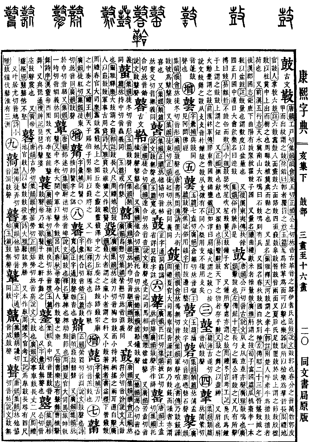 〔古文〕𩉲《唐韵》工戸切《集韵》《韵会》果五切《正韵》公土切,𠀤音古。革音之器。伊耆氏造鼓。《说文》鼓,郭也。春分之音,万物郭皮甲而出,故谓之鼓。《徐锴曰》郭者,覆冒之意。《玉篇》瓦为椌,革为面,可以击也。乐书,鼓所以检乐,为羣音长。《周礼·地官·鼓人》掌敎六鼓。《注》六鼓:靁鼓八面,灵鼓六面,路鼓四面,鼖鼓,皋鼓,晋鼓,皆两面。又夏后氏足鼓,置鼓于趺上,谓之节鼓。殷楹鼓,以柱贯中,上出而树之也。周县鼓,植簨虡而县之也。 又星名。《尔雅·释天》河鼓谓之牵牛。《郭注》荆楚人呼牵牛为担鼓。担者,荷也。 又《前汉·五行志》天水冀南山大石鸣,曰石鼓,鸣则有兵。 又国名。春秋鼓国,白狄别种。《左传·昭二十三年》晋袭鼓,灭之。《后汉·郡国志》钜鹿下曲阳有鼓聚,故翟鼓子国。 又量名。《礼·曲礼》献米者操量鼓。《广雅》斛谓之鼓。《荀子·富国篇》瓜桃枣李,一本数以盆鼓。《注》鼓,量也。谓数度以盆量也。 又《后汉·东夷传》扶余国,正月,国中连日大会飮乐,名曰迎鼓。 《集韵》俗作皷,非是。*考证:〔乐器,鼓所以检乐,为羣音长。〕 谨按玉篇无此文,语见韵会引乐书。谨改乐器为乐书。