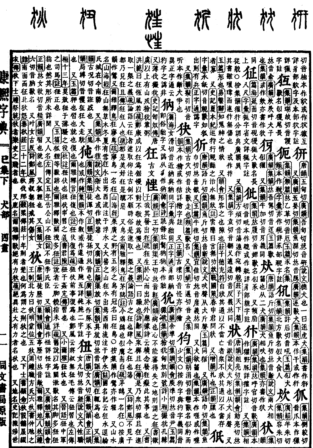 〔古文〕𢚇《广韵》巨王切《集韵》渠王切,𠀤音軖。《广韵》病也。心不能审得失之地。则谓之狂。《书·微子》我其发出狂。《疏》狂生于心,而出于外。应璩诗云:积念发狂痴,此其事也。 又《书·洪范》曰狂恒风若。《疏》郑康成以狂为倨慢,以对不敬,故为慢也。 又《集韵》一曰躁也。《诗·鄘风》众穉且狂。《传》是乃众幼穉且狂,进取一槩之义。《疏》论语云:狂者进取,仰法古例,不顾时俗,是进取一槩之义。《论语》古之狂也肆,今之狂也荡。 又《诗·郑风》不见子都,乃见狂且。《传》狂,狂人也。《疏》都是美好,狂是丑恶。 又鸟名。《尔雅·释鸟》狂,茅鸱。《注》今鶂鸱也。似鹰而白。《疏》茅鸱一名狂。◎按广韵作鵟。又《尔雅·释鸟》狂,㝱鸟。《疏》㝱鸟一名狂。《山海经》栗广之野,有五彩之鸟,有冠,名曰狂鸟。〇按集韵作鵟。亦作𨿗。 又山水名。《山海经》狂山无草木,冬夏有雪,狂水出焉,西流,注于浮水。又大𩇵之山,狂水出焉,西南流,注于伊水。《注》国名记云:狂水迳纶氏城,在今南阳。 又《集韵》本作𤝵。《说文》狾犬也。或作𤝶𢙌。 又《广韵》《正韵》渠放切《集韵》具放切,𠀤音诓。《广韵》狂,辄为也。 又《集韵》古况切,音诳。惑也。 又《集韵》局缚切,音戄。狂狂,犬走貌。