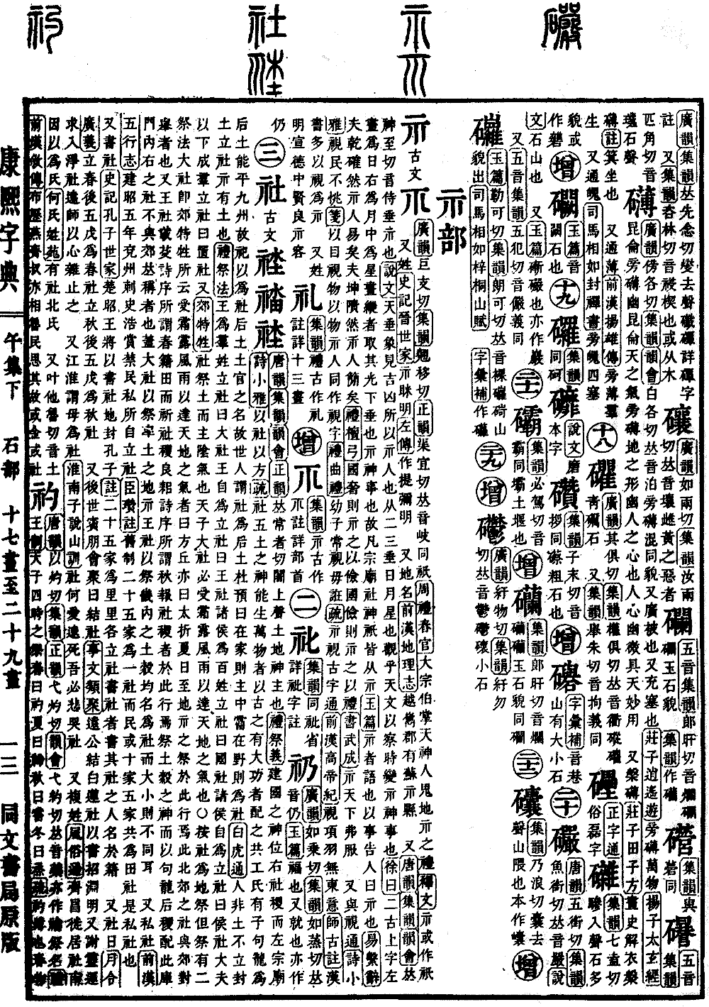 《集韵》礼古作礼。注详十三画。*(礼)〔古文〕礼𠃞𤔑《广韵》卢启切《集韵》《韵会》里弟切《正韵》良以切,𠀤音蠡。《说文》礼,履也,所以事神致福也。《释名》礼,体也。得其事体也。《韵会》孟子言礼之实节文斯二者,盖因人心之仁义而为之品秩,使各得其叙之谓礼。 又姓。《左传》衞大夫礼孔。 《徐铉曰》五礼莫重于祭,故从示。豊者,其器也。