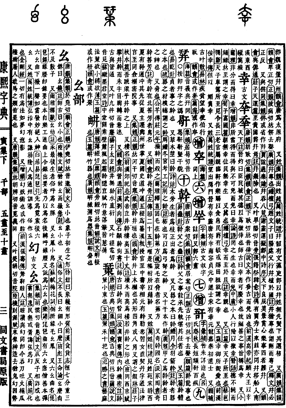 〔古文〕㚔𠂷《唐韵》胡耿切《集韵》《韵会》《正韵》下耿切,𠀤音幸。《说文》本作𡴘。吉而免凶也。《前汉·高帝纪》愿大王以幸天下。《注》晋灼曰:臣民被其德,以为徼幸也。师古曰:幸者,可庆幸也。故福善之事皆称为幸。 又《小尔雅》非分而得曰幸。《增韵》非所当得而得,与不可免而免曰幸。《论语》罔之生也,幸而免。《中庸》小人行险以徼幸。《晋语》德不纯,而福禄𠀤至,谓之幸。《荀子·富国篇》朝无幸位,民无幸生。 又冀也。《礼·檀弓》幸而至于旦。《注》幸,觊也。 又《玉篇》幸天子所至也。《蔡邕·独断》天子车驾所至,见令长三老官属,亲临轩作乐,赐以食帛,民爵有级,或赐田租,故谓之幸。 又《玉篇》幸,御所亲爱也。《前汉·佞幸传》但以 媚贵幸。 又姓。《万姓统谱》望出鴈门,晋有幸灵。唐有幸南容,贞元中进士。宋有幸元龙,嘉泰初进士。 又《韵补》古叶散。《易林》疾贫望幸,使伯行贩。 《韵会》或作𠂷。《篇海》或作𢆎。𠂷字原作夭下糸。